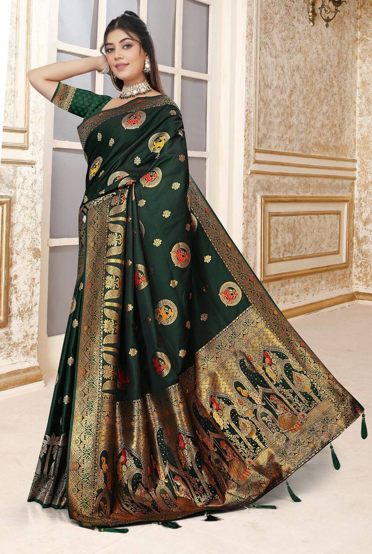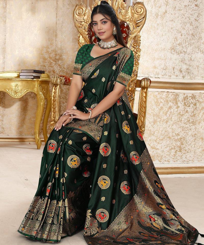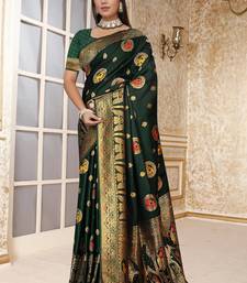 Dark green satin silk banarasi saree with heavy gold zari weaving