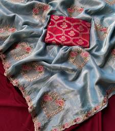 Product Description | Paper Silk Crush Saree With Beautiful Floral Embroidery All Over The Saree . It Also Has Swarovski Work On The Buttas. With Very Beautiful Cutwork Border Teamed With A Beautiful Banarasi Contrast Blouse |