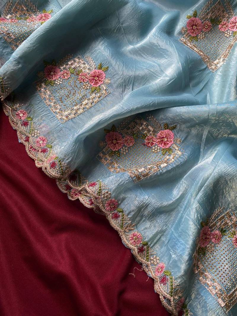 Product Name | Sky Paper Silk Blend Crush Saree With Swarovski Work On The Buttas N Cutwork Border | |