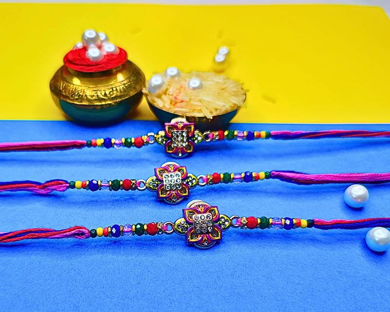 | Product Description | Celebrate The Eternal Bond Of Love With This Premium Designer Set Of Three Rakhi For Brother, Thoughtfully Handcrafted Using High Quality Cotton Thread, Adorned With American Diamond (Ad) Stones, Sparkling Zircons, Traditional Beads, And Intricate Meena Work. This Rakhi Perfectly Blends Ethnic Charm With Modern Elegance, Making It A Meaningful Gift For Raksha Bandhan. |