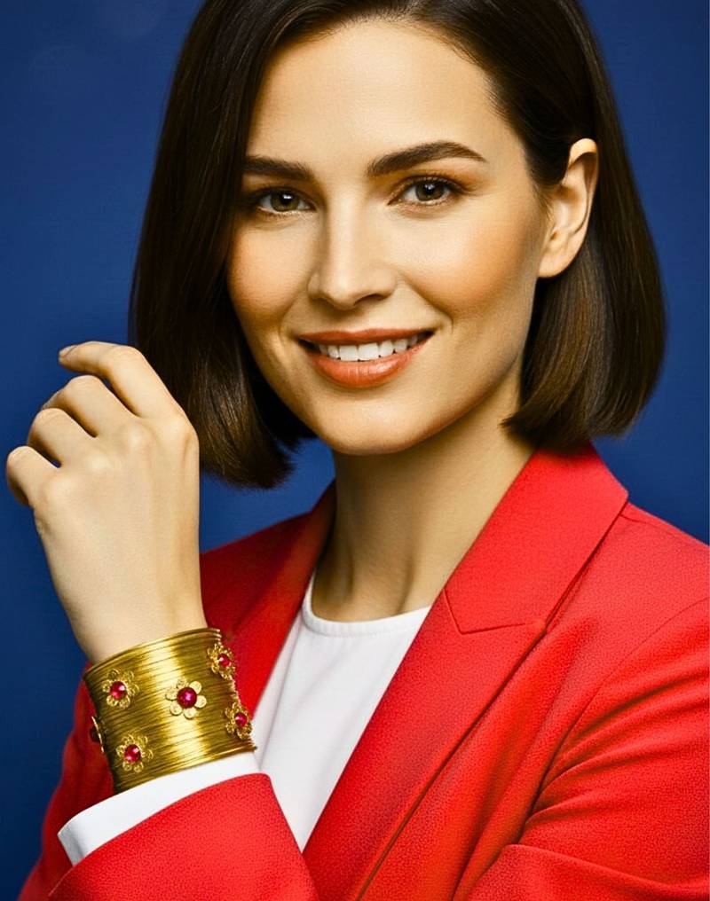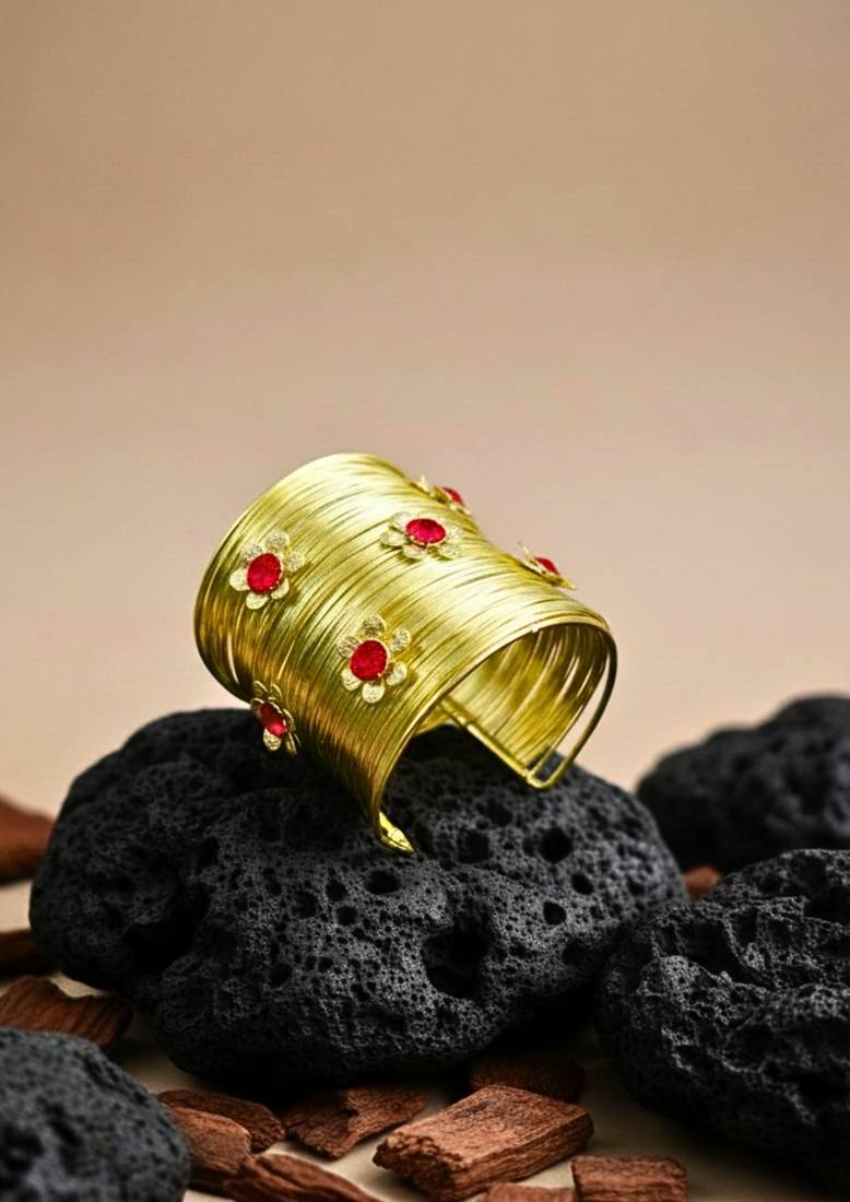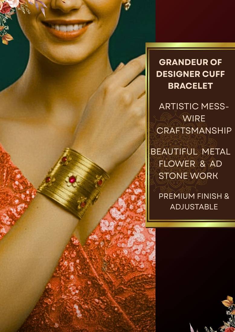| Product Description | Gold Plated Mess Wire Cuff Bracelet Adorned With A Scattered Dazzling Beautiful Metal Flower With Red Korean Cz Shiny Stone. Its Intricate Wire Design And Bold Centerpiece Exude Elegance And Sophistication. Lightweight, Adjustable, And Perfect For Elevating Both Casual And Festive Looks. A Timeless Statement Piece For Every Jewelry Lover. |