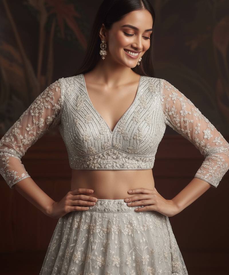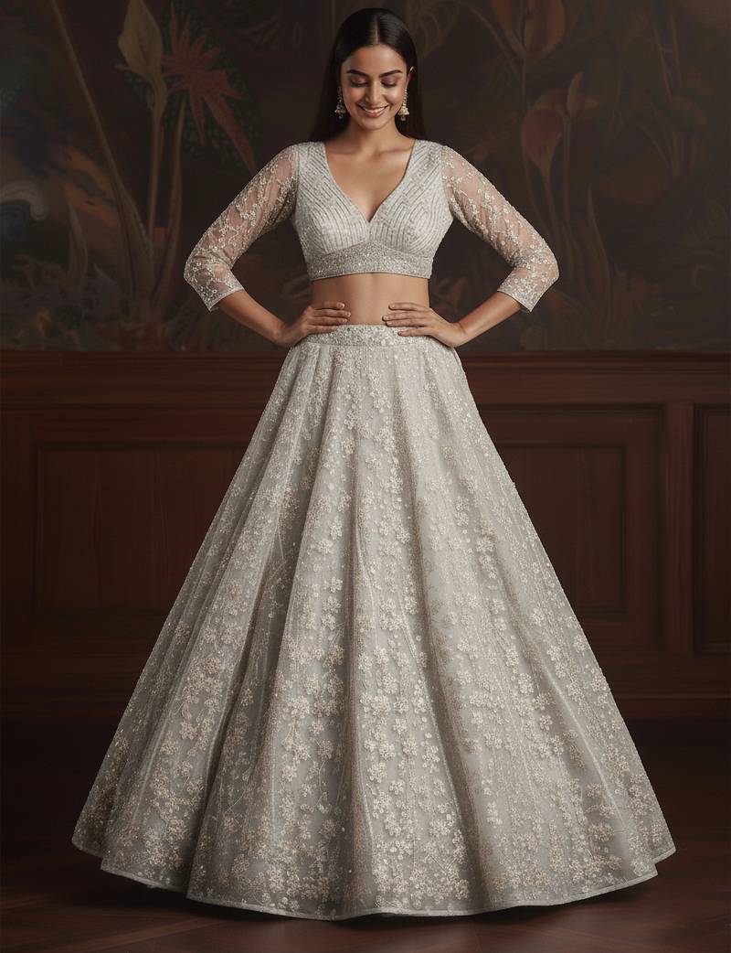 | Product Name | Delightfully White Fancy Dori, Sequins Studded Embroidered With Zircon Diamond Studded Net Bridal Wear Lehenga Choli | |
