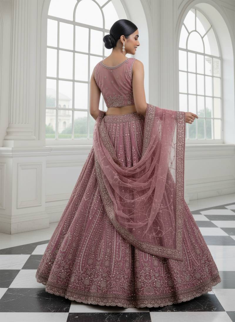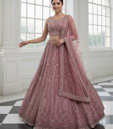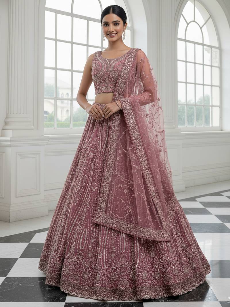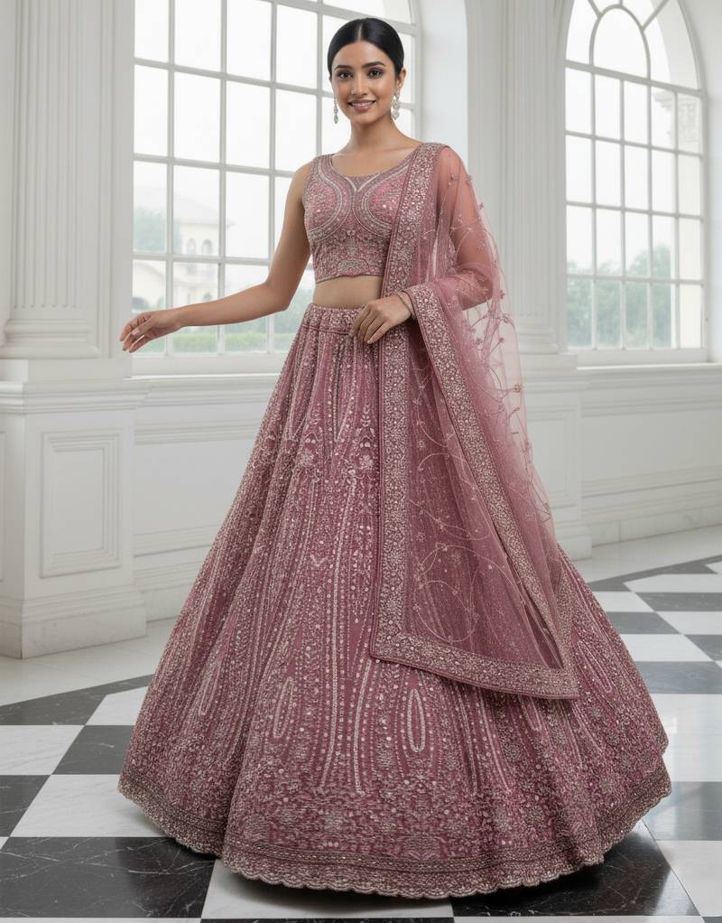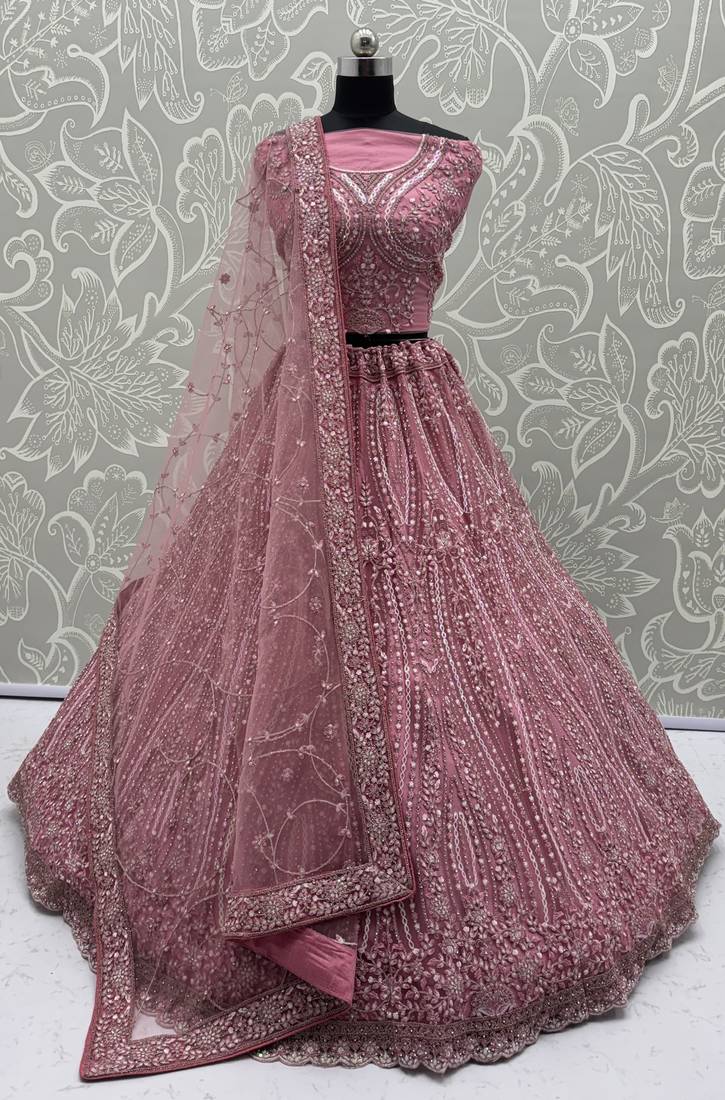 Product Name Enthralling Pink Dori, Multi Thread, Sequence Embroidered And Zircon Diamond Heavy Net Bridal Lehenga Choli