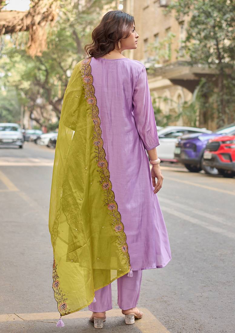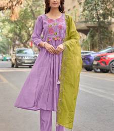Women floral embroidered panelled thread work chanderi cotton kurta with trousers & with dupatta