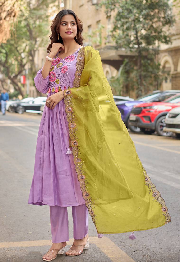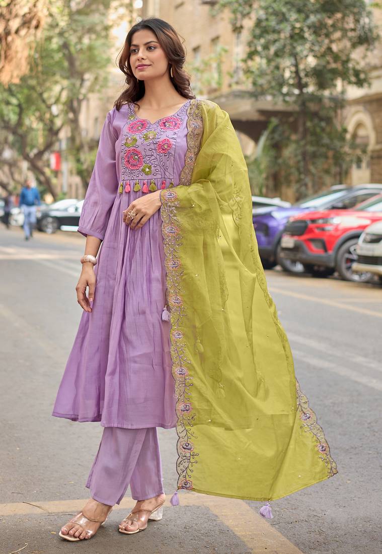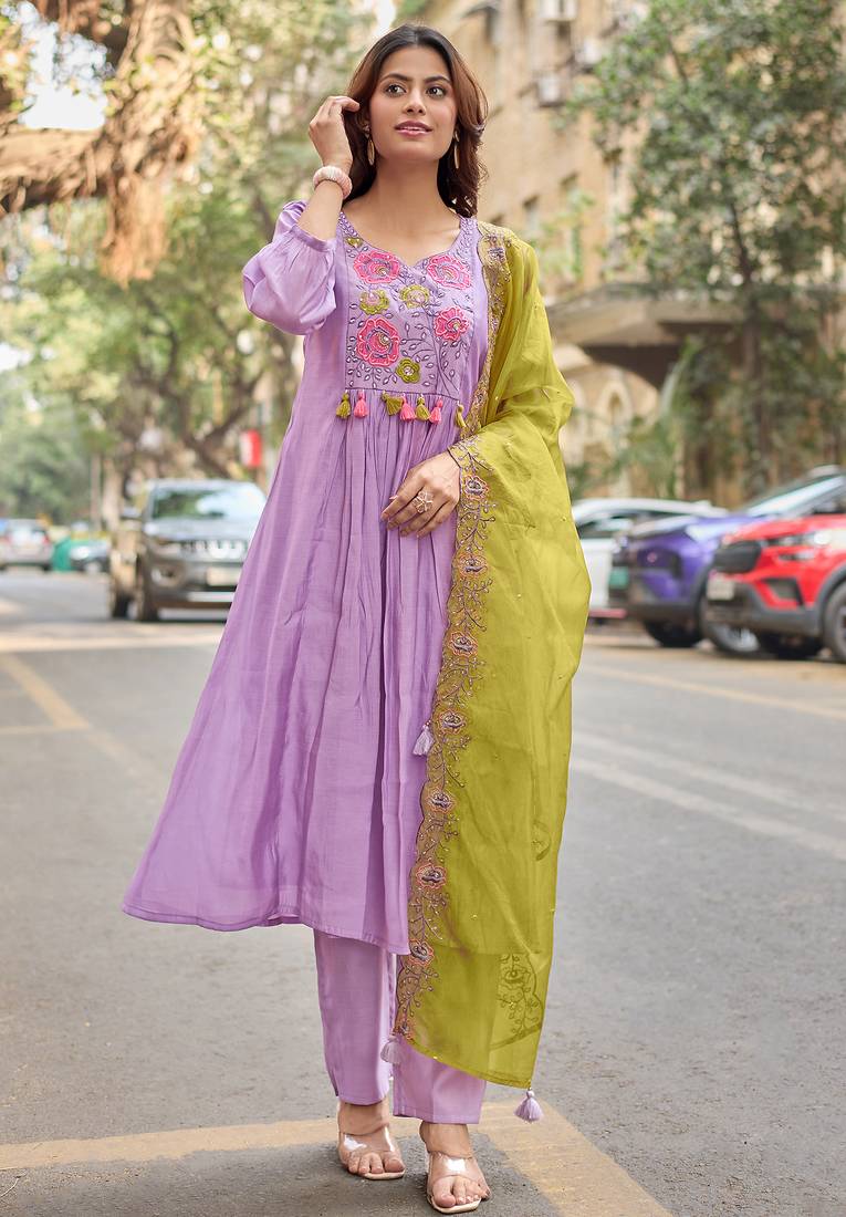 | Product Name | Women Floral Embroidered Panelled Thread Work Chanderi Cotton Kurta With Trousers & With Dupatta | |