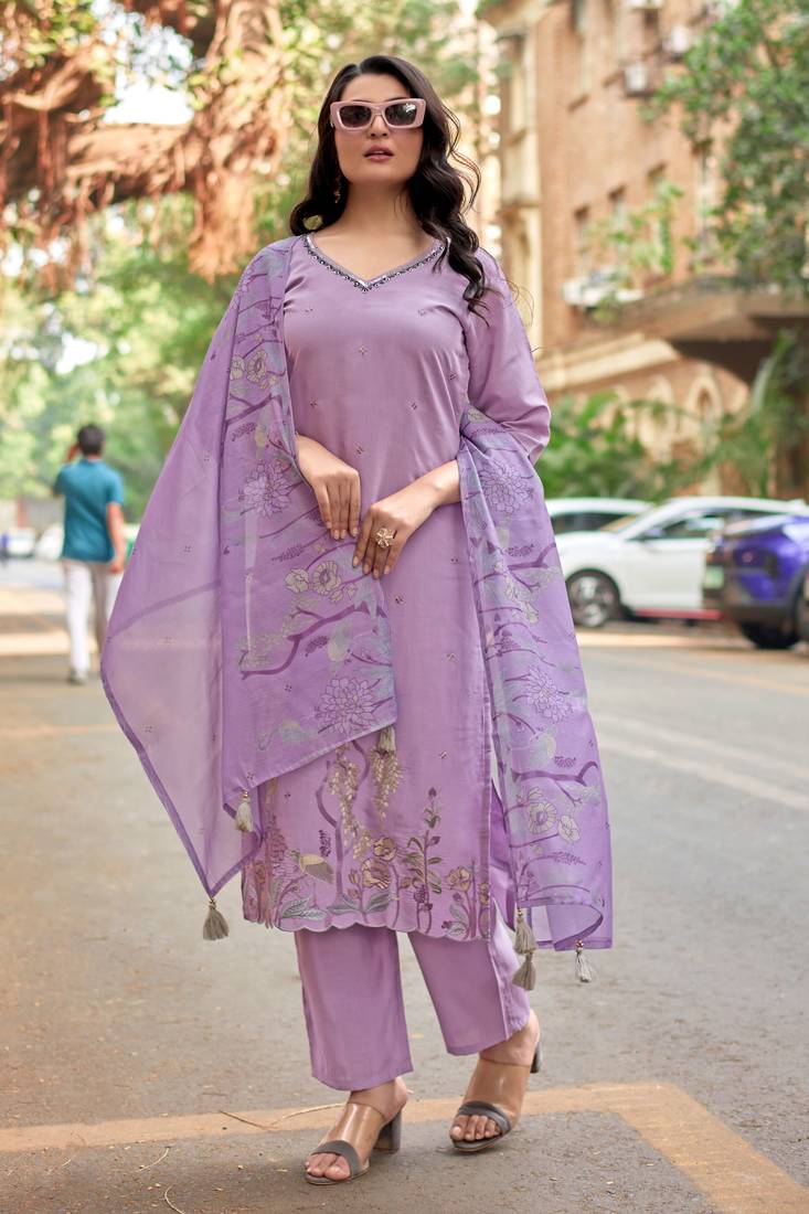 Women floral embroidered regular roman slik kurta with trousers & dupatta