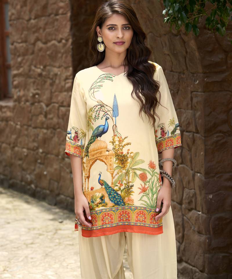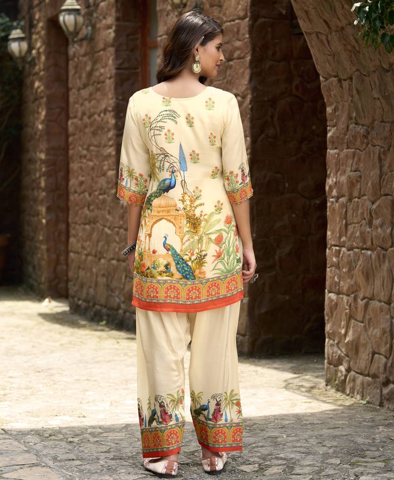 Product Description | Trendy Beige Pure Crepe Co Ord Set Featuring An Animal Print Straight Tunic Embellished With Delicate Beadwork. Paired With A Fully Elasticated Printed Palazzo, It Offers Effortless Comfort And Chic Appeal. Perfect For Festive Events, Parties, And Celebrations, This Stylish Ensemble Blends Bold Design With Timeless Elegance, Making It A Standout Addition To Your Wardrobe. |