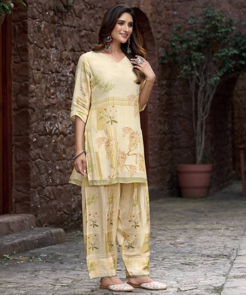 Product Name | Beige Pure Crepe Floral Printed Embellished Festive & Party Co Ord Set | |