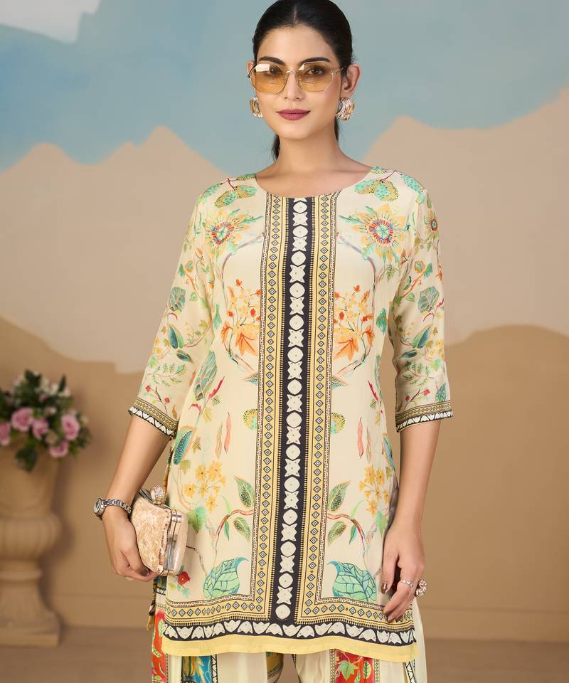 Product Description | Chic Beige Pure Crepe Co Ord Set Showcasing A Floral Straight Tunic Enhanced With Elegant Beadwork. Paired With A Fully Elasticated Printed Palazzo, It Offers Ease, Comfort, And Timeless Style. Perfect For Festive Celebrations, Parties, And Special Gatherings, This Versatile Ensemble Blends Subtle Charm With Refined Sophistication, Making It A Graceful Addition To Your Wardrobe. |