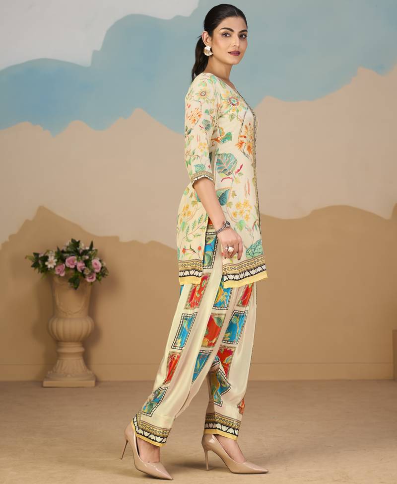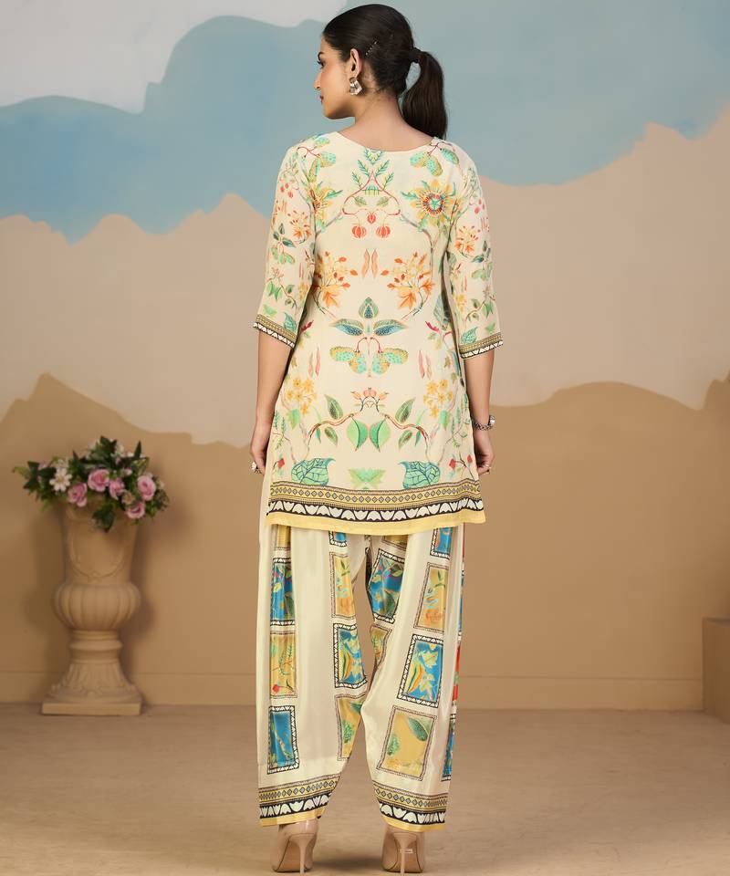 Beige pure crepe floral printed embellished festive & party co-ord set