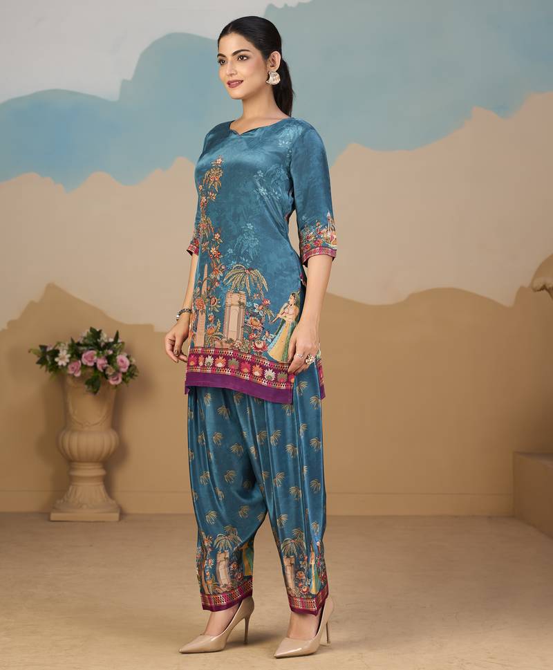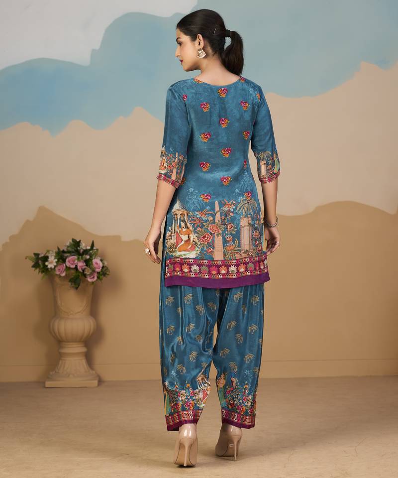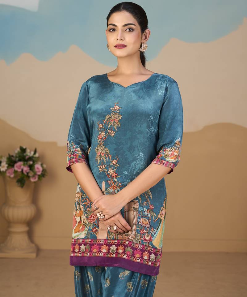 Product Description | Elegant Teal Blue Pure Crepe Co Ord Set Featuring A Floral Straight Tunic Adorned With Delicate Beadwork. Paired With A Fully Elasticated Printed Palazzo, It Ensures Comfort With A Stylish Appeal. Perfect For Festive Occasions, Parties, And Celebrations, This Graceful Ensemble Blends Vibrant Color With Timeless Sophistication, Making It A Standout Choice For Your Wardrobe. |