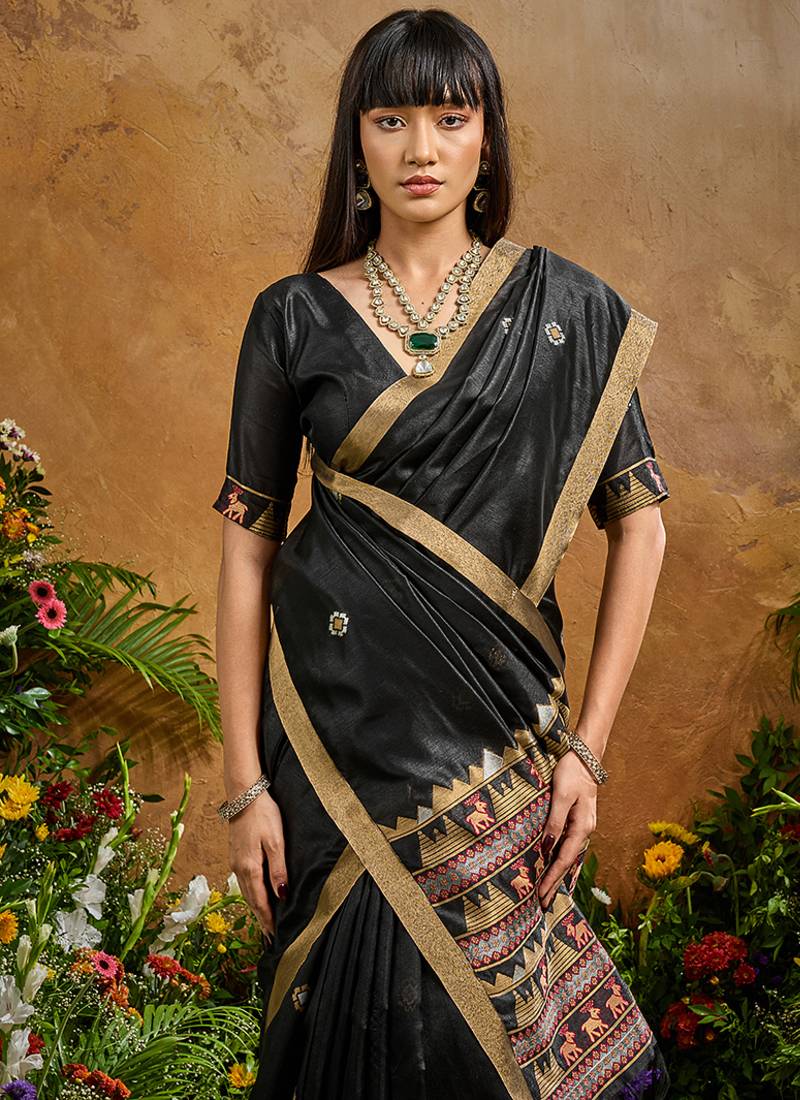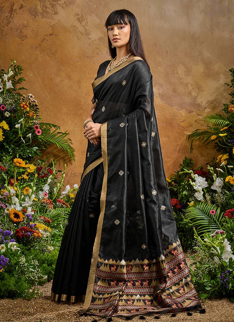 Black tussar art silk woven work saree