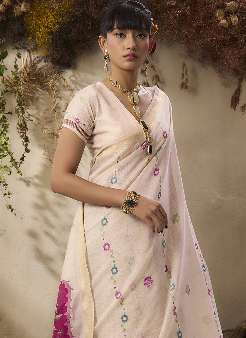Cotton blend woven cream saree