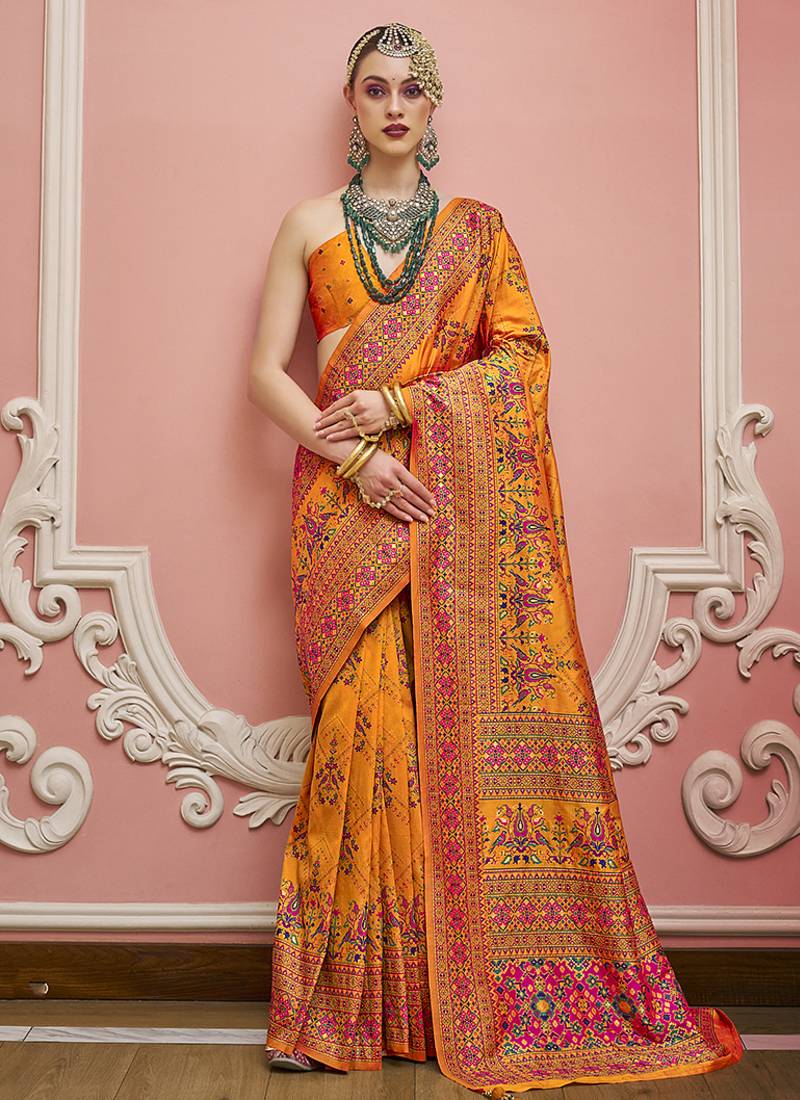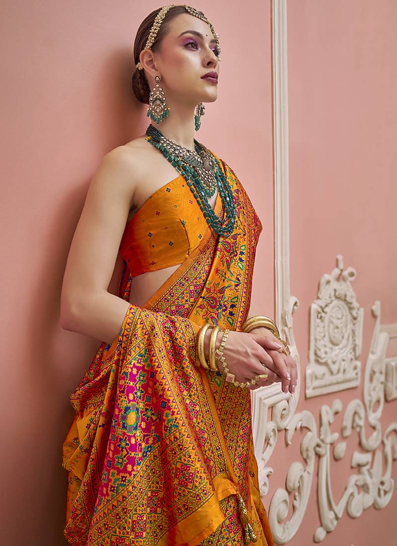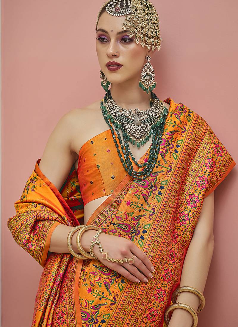 orange faux banarasi art silk traditional saree with meenakari and weaving work