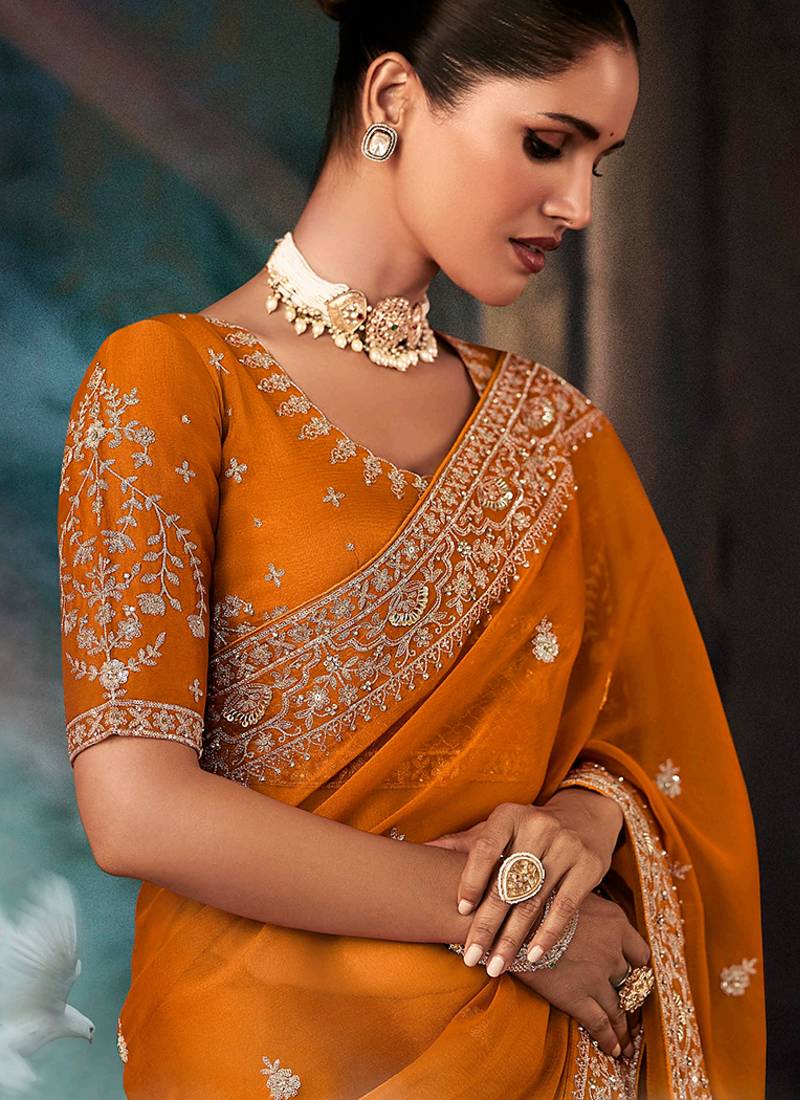 | Product Name | Orange Wear Fabric Embroidery Bridal Reception Festival Wedding Wear Heavy Border Saree | |
