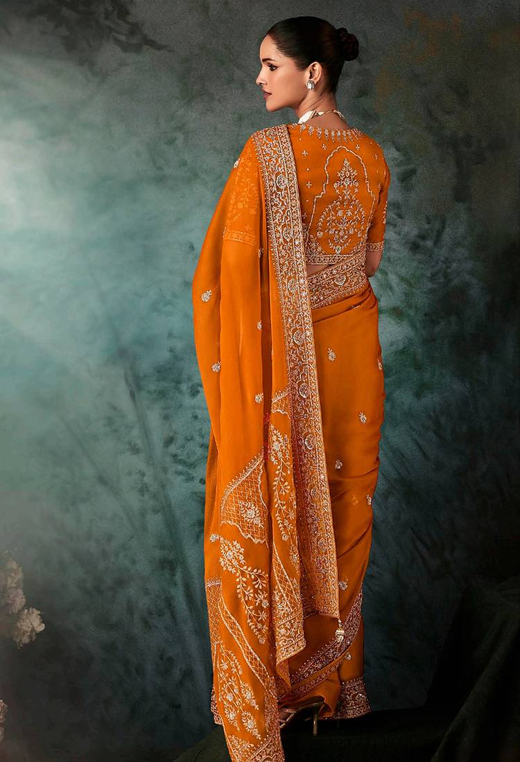 Orange wear fabric embroidery bridal reception festival wedding wear heavy border saree
