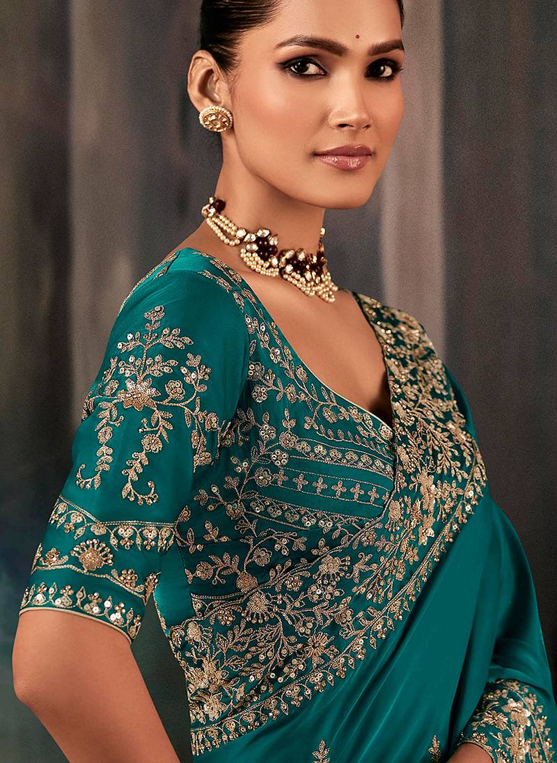 | Product Name | Teal Faux Satin Embroidery Bridal Reception Festival Wedding Wear Heavy Border Saree | |