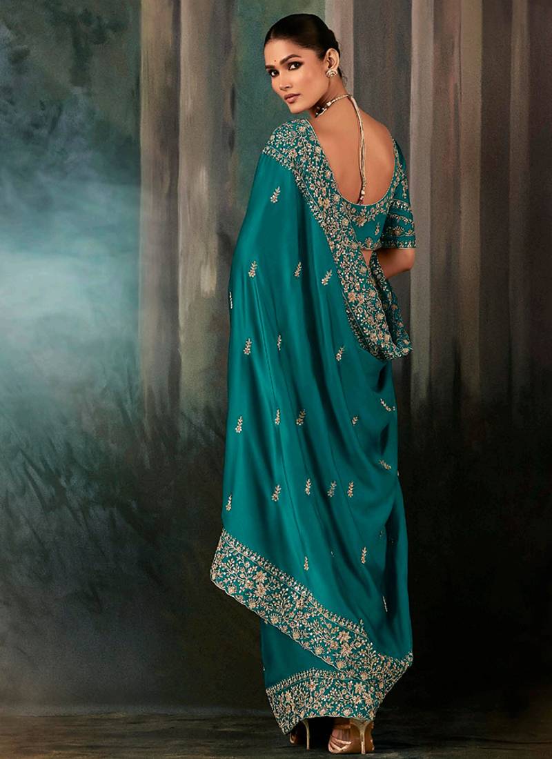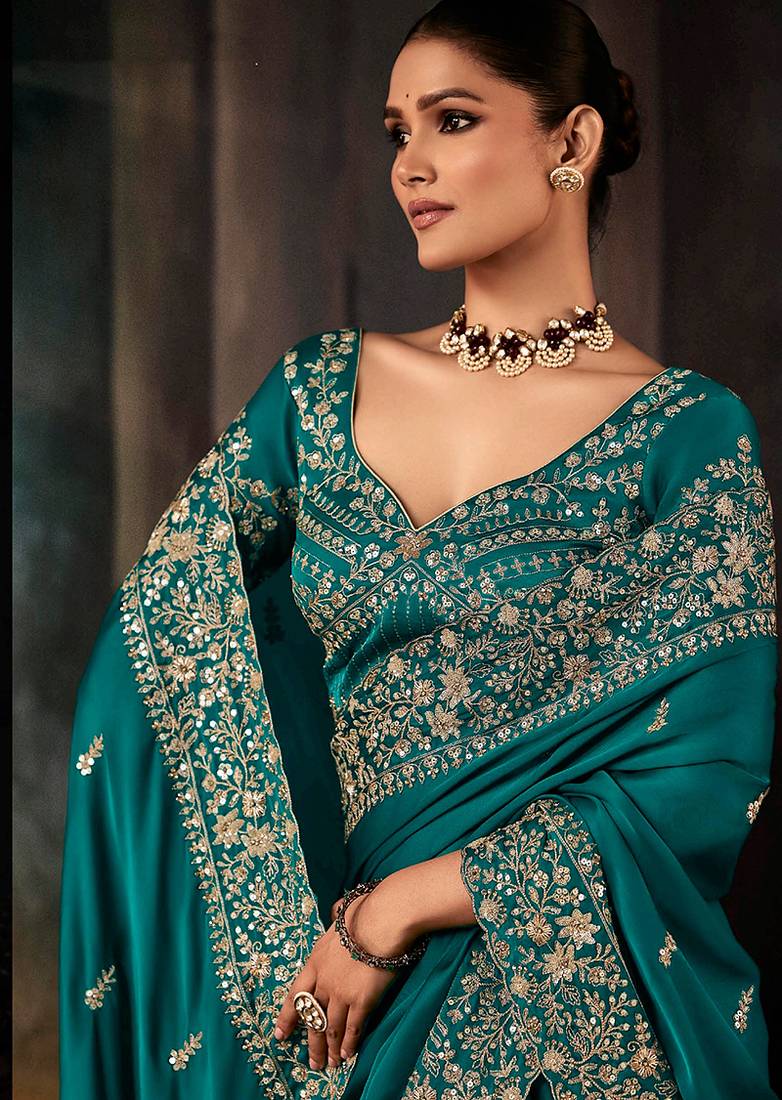 Teal faux satin embroidery bridal reception festival wedding wear heavy border saree