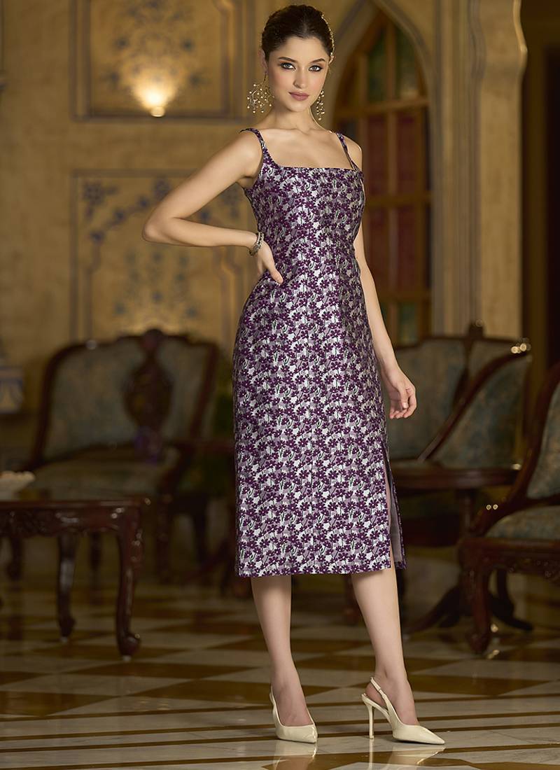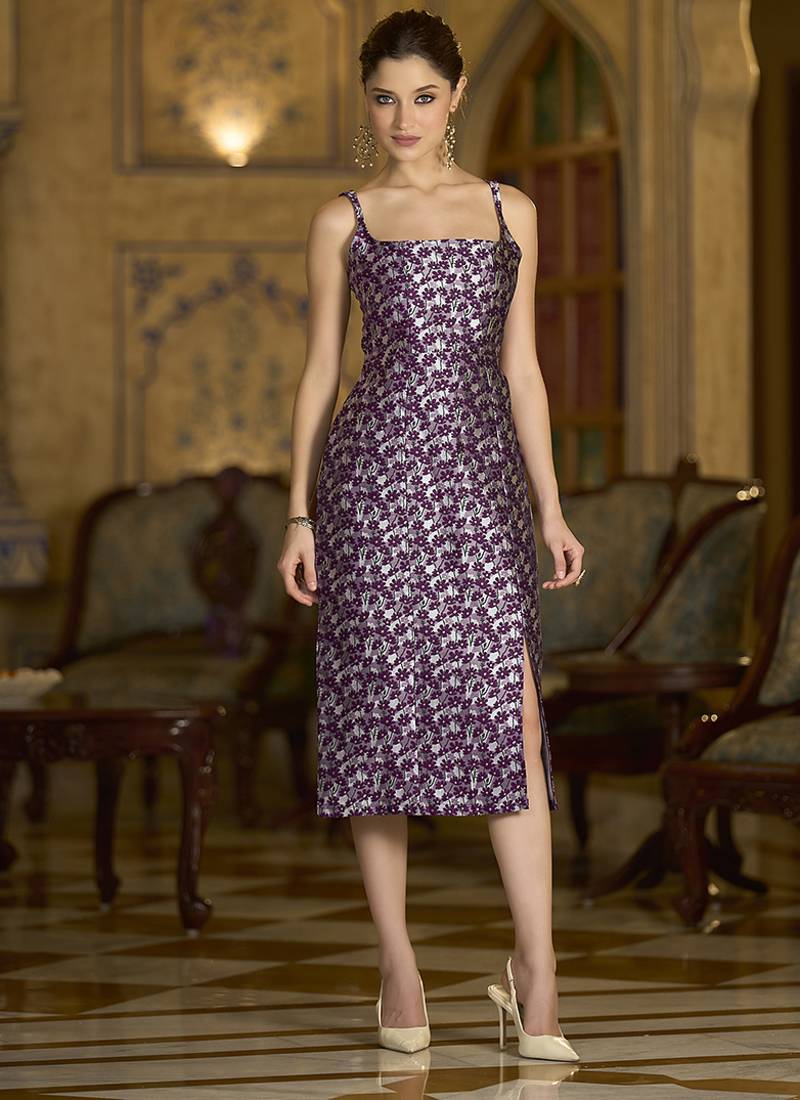 | Product Description | Crafted In Luxurious Jacquard Fabric, This Brocade Dress Shines With Intricate Zari And Contrast Thread Weaving. Designed With A Chic Square Neckline And Delicate Strappy Shoulders, It Brings A Blend Of Elegance And Modernity. The Bodycon Silhouette With A Straight Hemline Is Elevated By A Daring Front Slit, While The Back Zip Ensures A Seamless Fit And Easy Wear. Perfect For Occasions Where Tradition Meets Contemporary Glamour. |