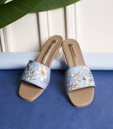 Women printed open toe block mules heels | ethnic slip-on sandals for women | sky blue comfort footwear