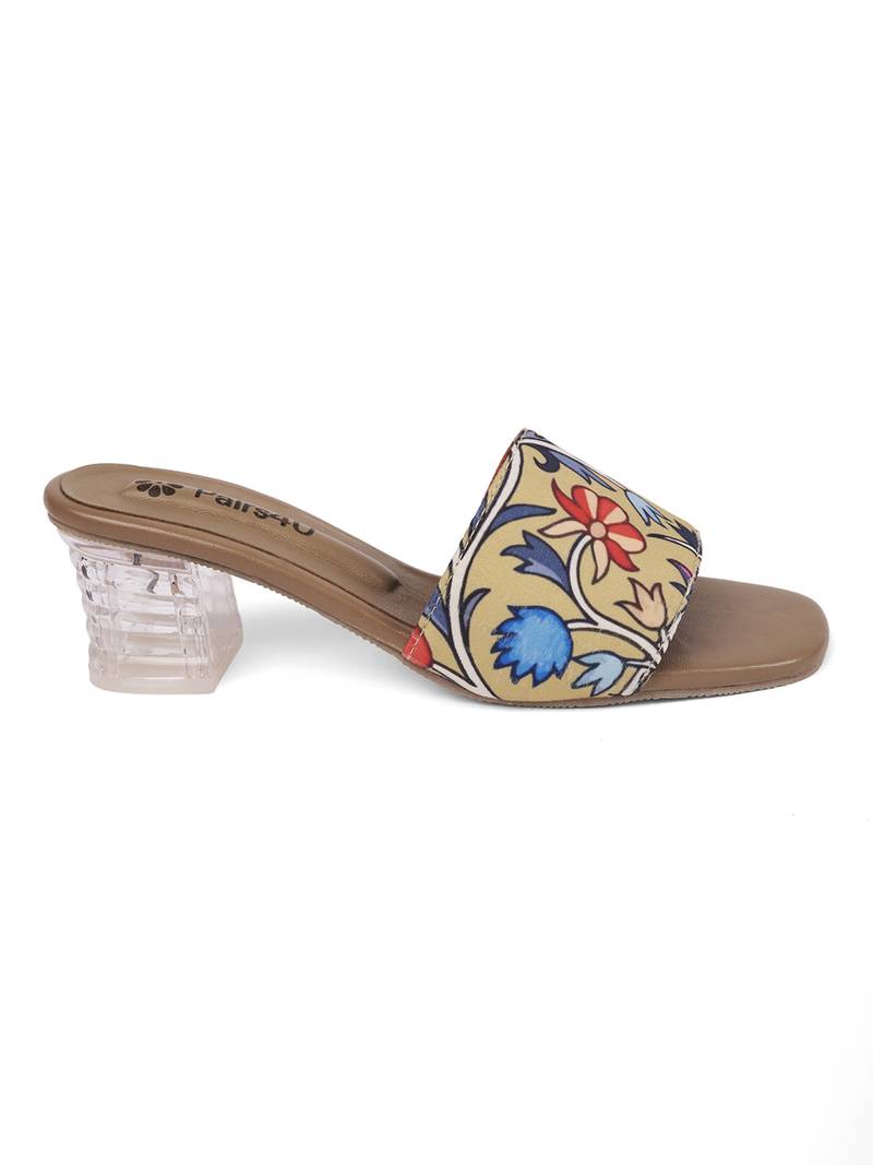 Step Into Elegance With The Pairs4 U Women Printed Open Toe Block Mules Heels. These Stunning Sandals Feature A Vibrant Yellow Upper That Adds A Splash Of Color To Any Ensemble. Designed For The Modern Woman, These Mules Combine Style And Comfort With Their Open Toe Design And Sturdy Block Heel, Ensuring You Look Fabulous And Feel Great All Day Long. The Pvc Sole Offers Superior Grip, Making Them Suitable For Various Surfaces, Whether You're At A Festive Event Or A Casual Outing. The Slip On Design Guarantees Easy Wear, So You Can Step Out In Style Effortlessly. Perfect For Ethnic Wear, These Mules Seamlessly Complement Traditional Outfits While Also Adding A Trendy Twist To More Casual Looks. Whether You're Attending A Wedding Or Heading Out For A Brunch Date, These Heels Are Your Go To Choice For A Chic And Sophisticated Look.
