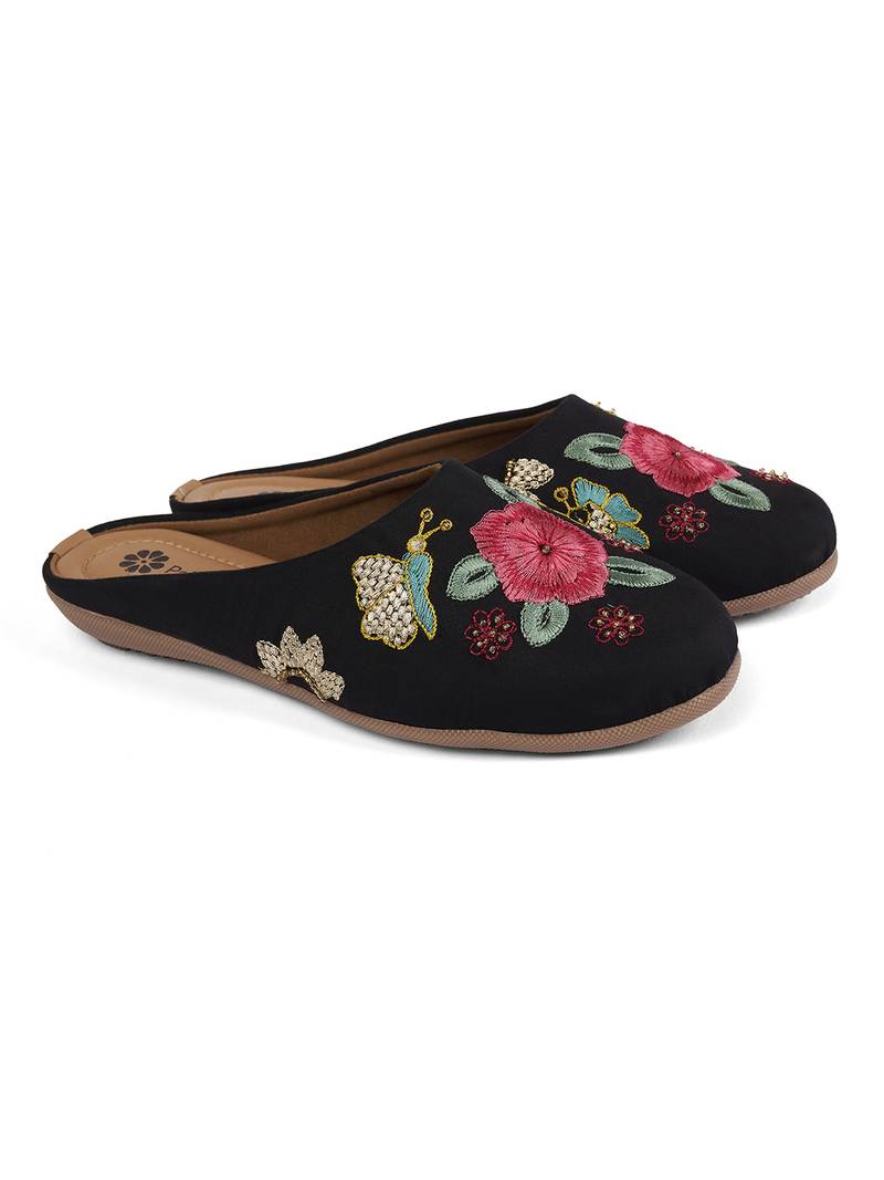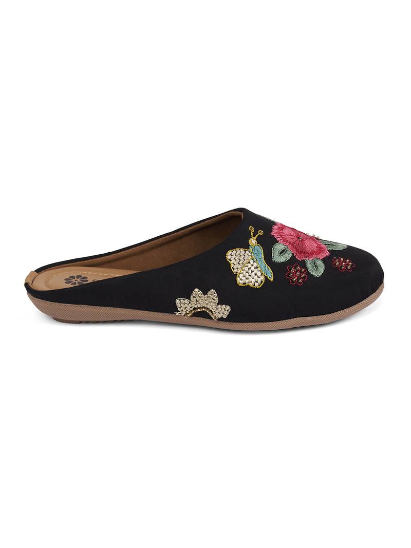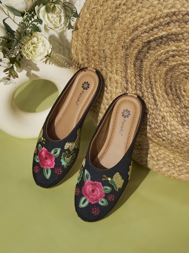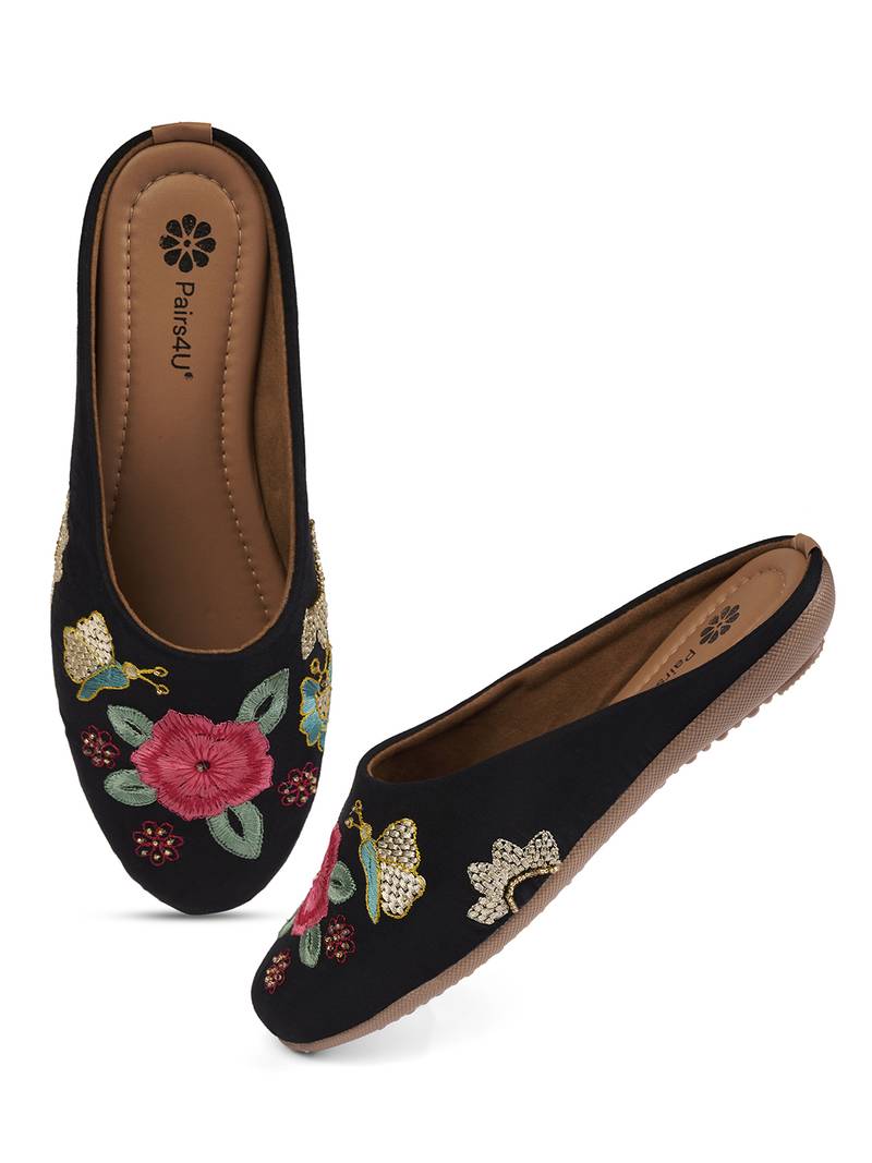 Women's black ethnic embroidered slip-on mojari mules | traditional juttis for casual & festive wear