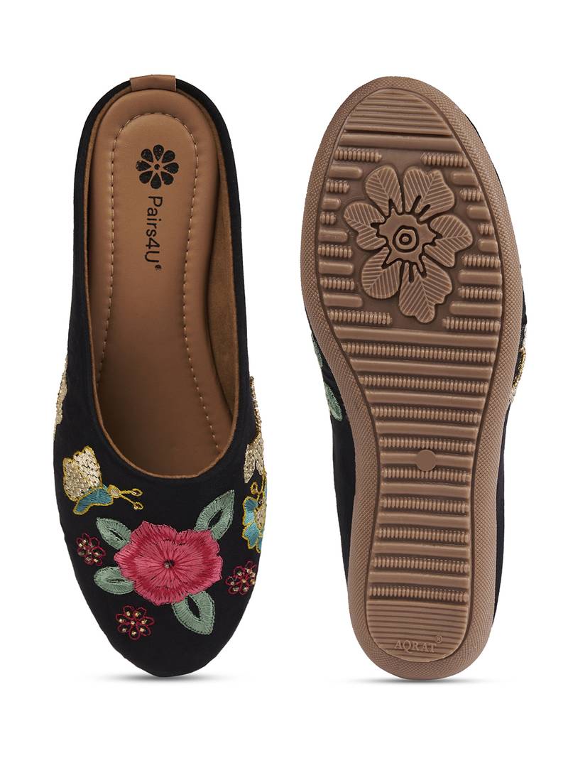 Step Into Elegance With Pairs4 U Women's Embellished Ethnic Mules Flats In Classic Black. These Beautifully Crafted Mules Feature A Canvas Upper Adorned With Intricate Embroidery, Offering A Stunning Blend Of Traditional Craftsmanship And Modern Style. The Stylised Toe Shape Adds A Unique Touch, Making These Shoes A Standout Addition To Any Wardrobe. Designed With Comfort In Mind, The Pvc Sole Provides A Soft Yet Durable Foundation, Allowing You To Walk With Ease Throughout Your Day. The Slip On Design Ensures Convenient Wear, Making These Mules An Ideal Choice For Busy Mornings Or Relaxed Evenings. Whether You're Dressing Up For A Festive Occasion Or Adding A Touch Of Elegance To Your Everyday Look, These Mules Effortlessly Enhance Your Style. Perfectly Suited For Ethnic Wear, They Pair Beautifully With Sarees, Salwar Suits, And Even Contemporary Outfits, Offering Versatility And Charm. Experience The Perfect Blend Of Fashion And Comfort With Pairs4 U's Exquisite Ethnic Mules.