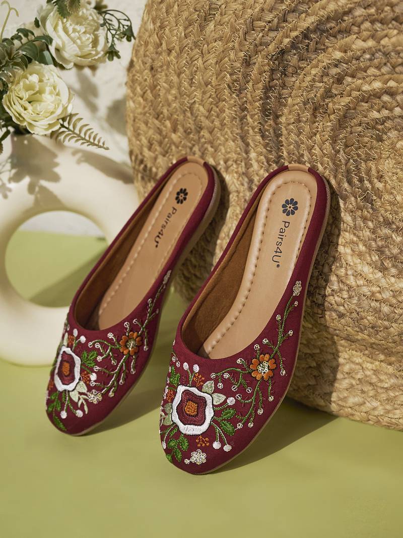 Elevate Your Ethnic Wardrobe With The Pairs4 U Women Embellished Ethnic Mules Flats. These Stunning Mules Feature A Maroon Canvas Upper, Intricately Embroidered To Bring A Splash Of Artisanal Elegance To Your Outfit. Designed With A Comfortable Slip On Style, These Flats Are Perfect For Those Who Are Always On The Go. Just Slide Them On And Step Out In Style. The Durable Pvc Sole Provides Excellent Grip And Stability, Making Them A Reliable Choice For Both Everyday Wear And Special Occasions. Whether You're Attending A Festive Celebration Or Enjoying A Casual Day Out, These Mules Offer Versatile Styling That Pairs Beautifully With Ethnic Attire As Well As Modern Outfits. Available In Sizes 4 To 9, These Flats Ensure A Perfect Fit For Everyone. Step Into Comfort And Style With Pairs4 U And Let Your Feet Do The Talking.