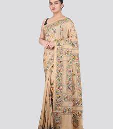 Beige handloom silk embroidered katha stitch work saree with blouse piece