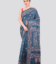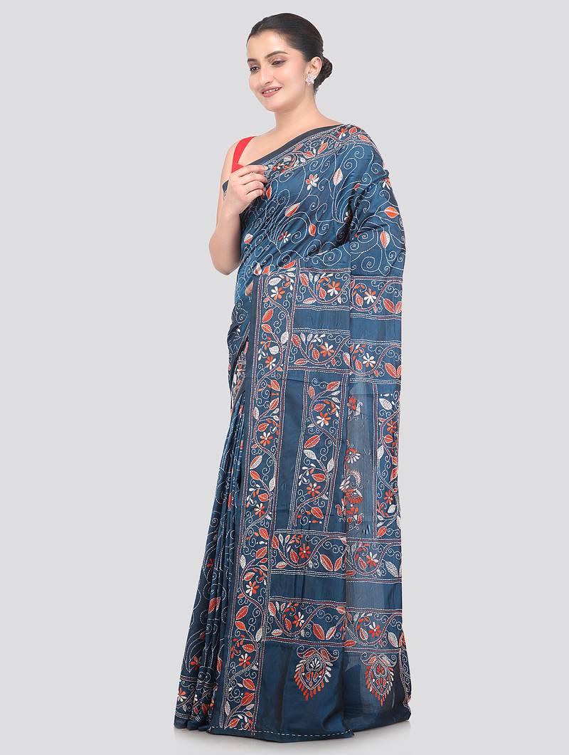 Tealblue handloom silk embroidered katha stitch work saree with blouse piece