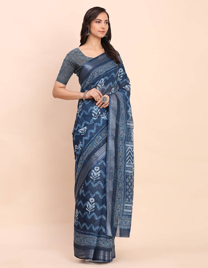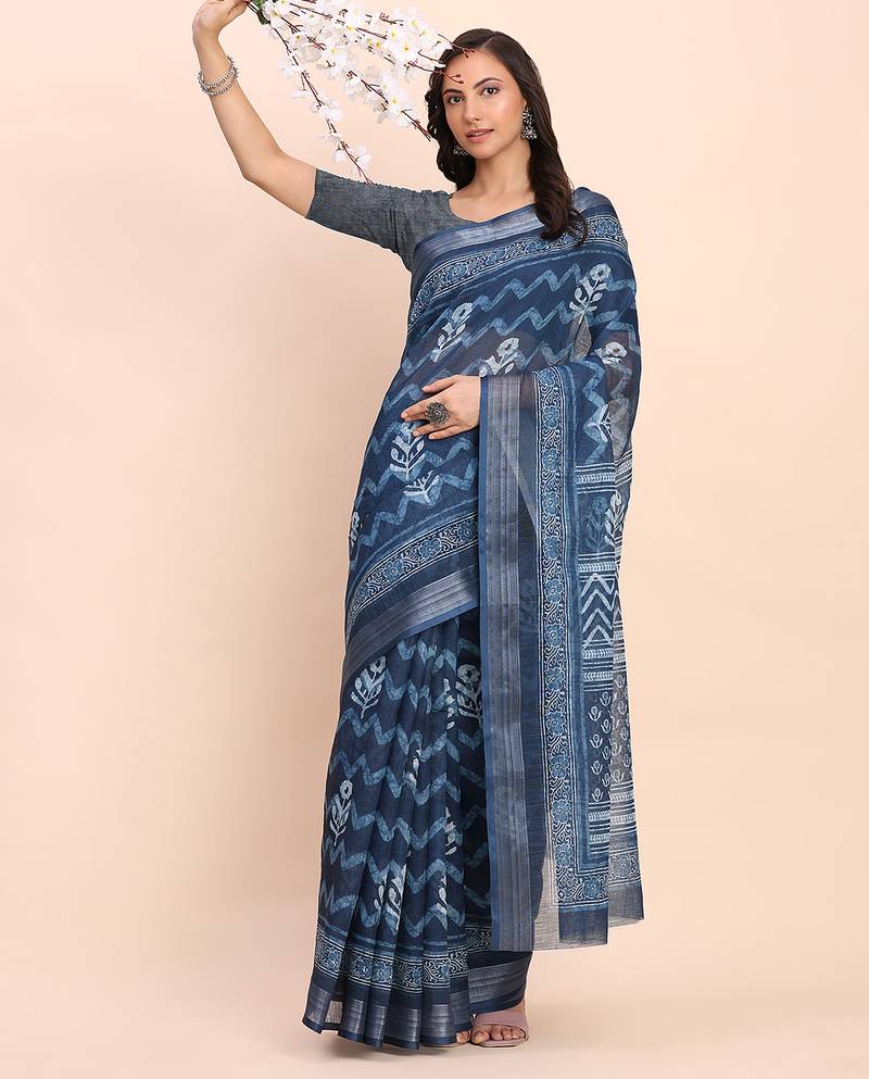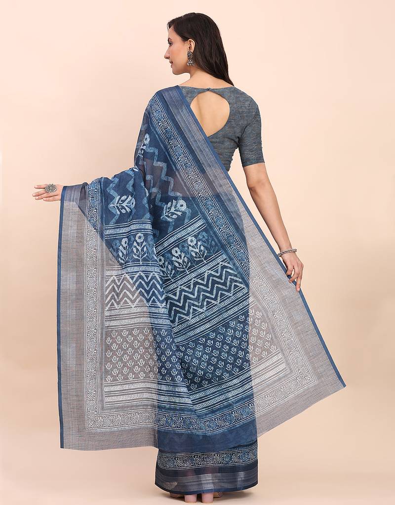 | Product Name | Blue Color Digital Print & Zari Border Linen Cotton Saree | |