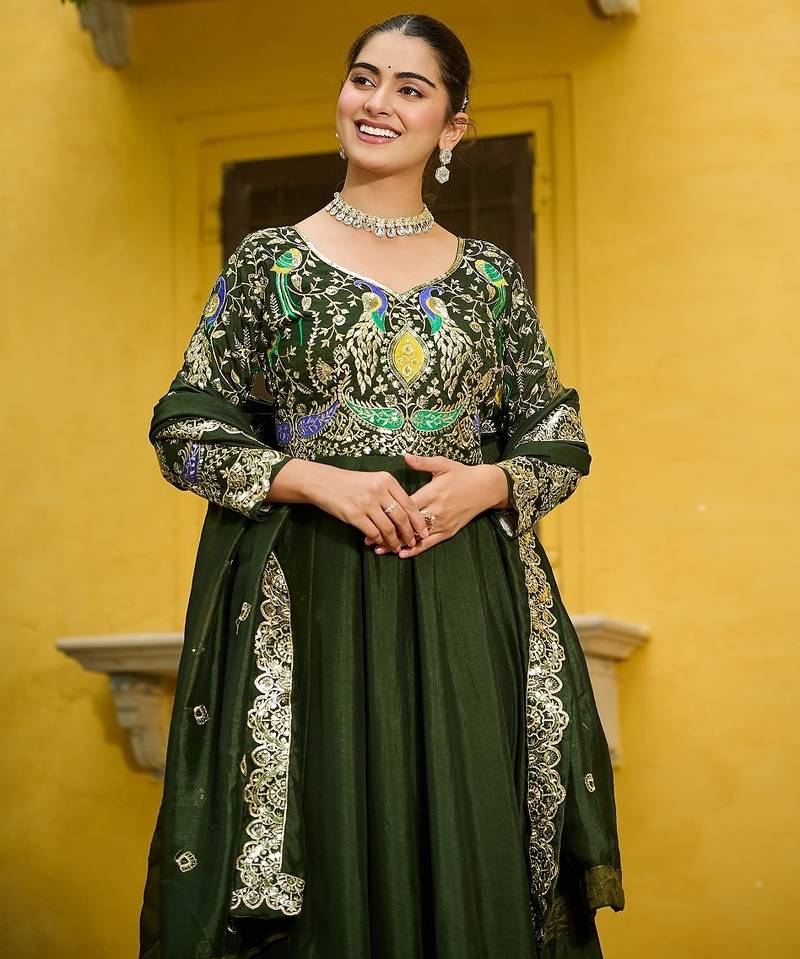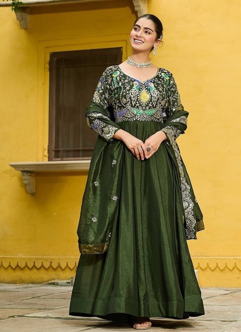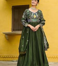 Green color thread embroidered work vichitra silk gown dupatta stitched
