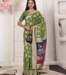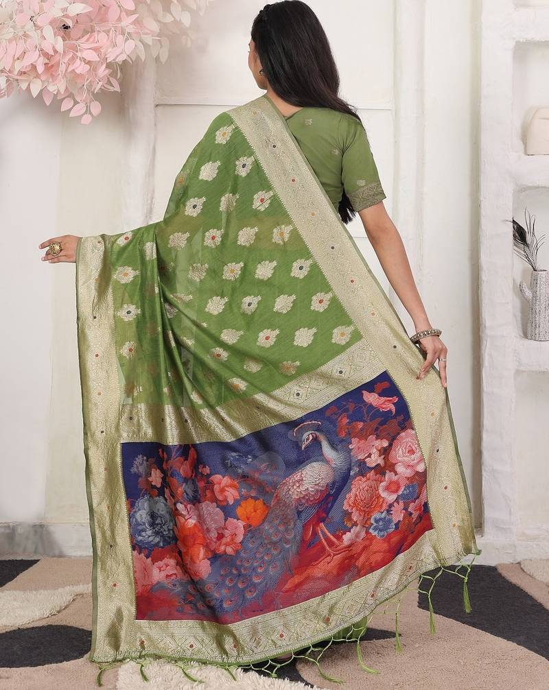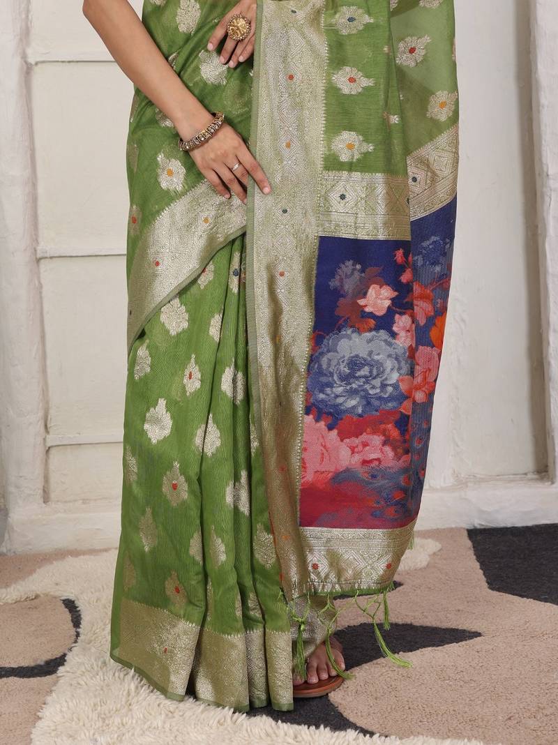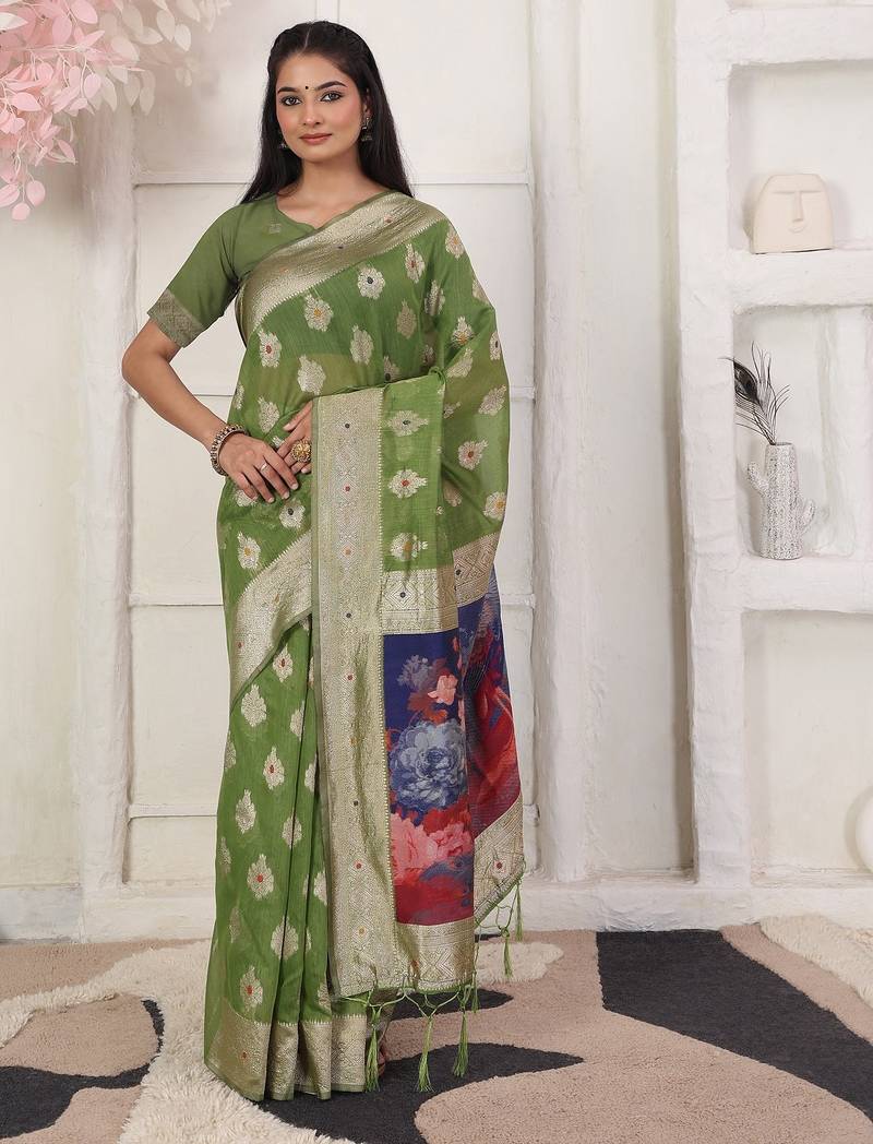 | Product Name | Green Color Woven Linen Cotton Flower & Peacock Pallu Saree | |