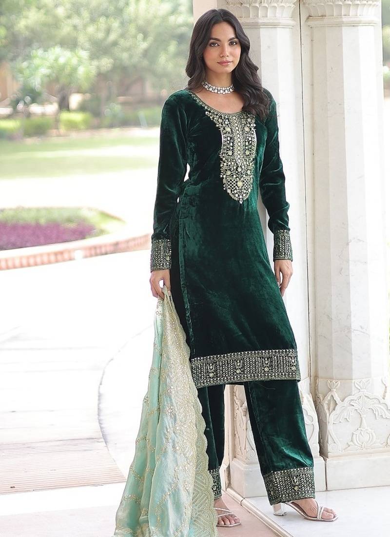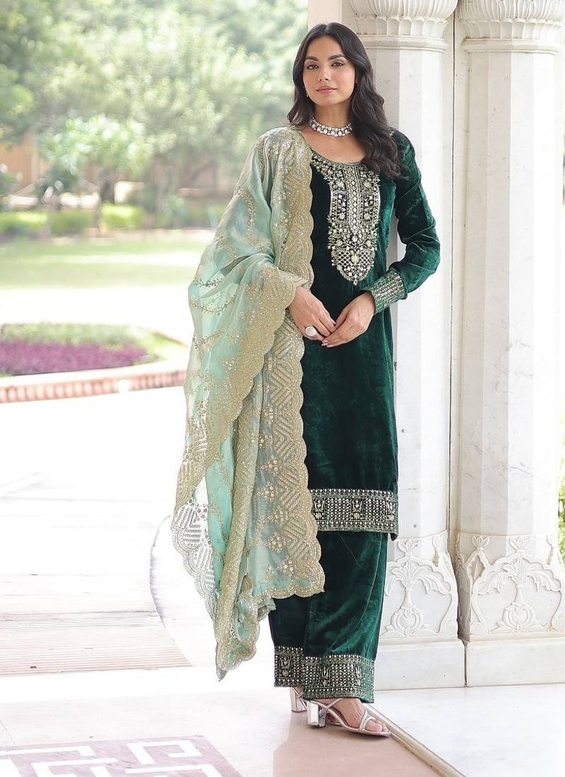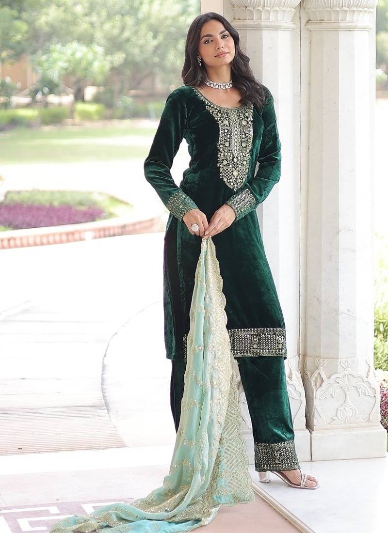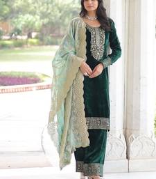 Green color zari sequins embroidered work velvet top pant dupatta stitched