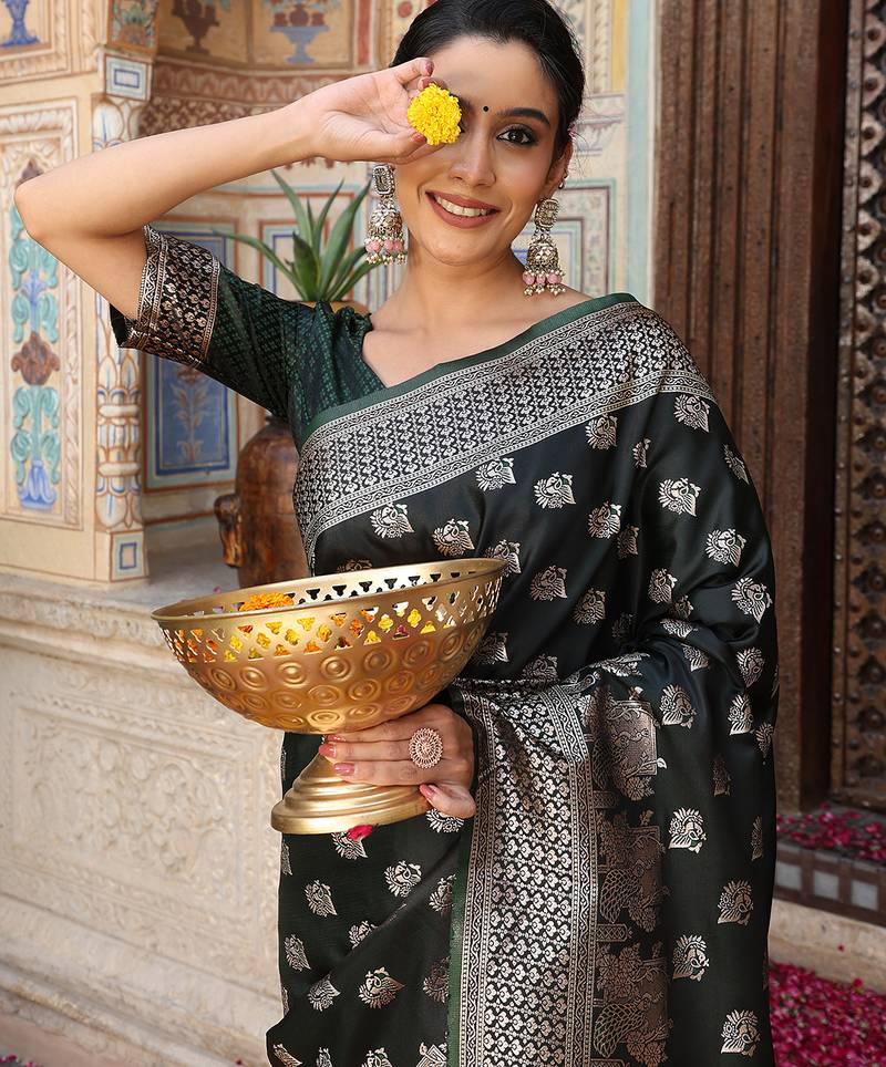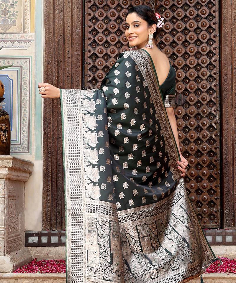Green color zari woven silk blend saree with un-stitch blouse