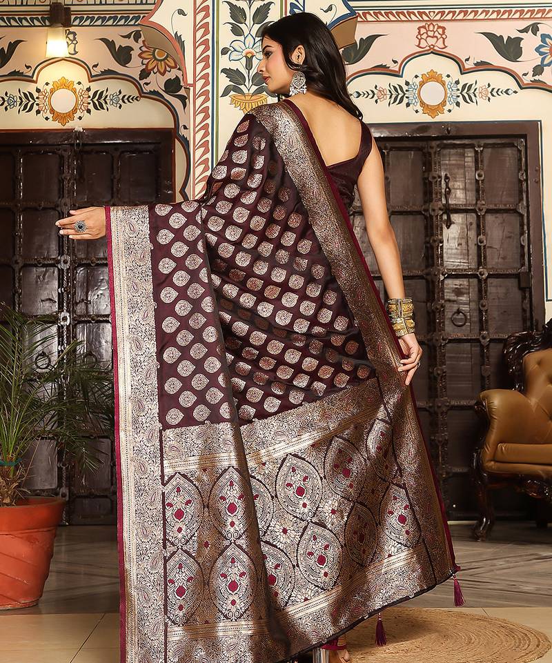 Maroon color zari woven silk blend saree with un-stitch blouse