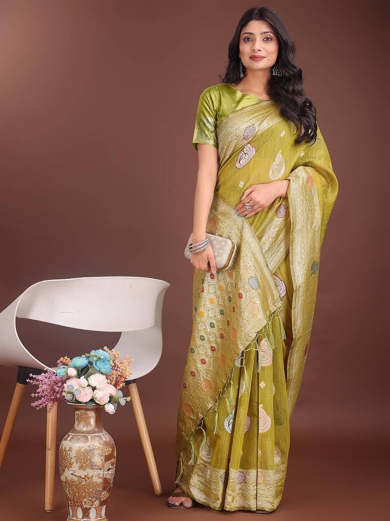 | Product Description | Linen Cotton Zari Woven & Tassels Pallu Work Women's Beautiful Indian Party Wear Festival Saree With Un Stitched Blouse |