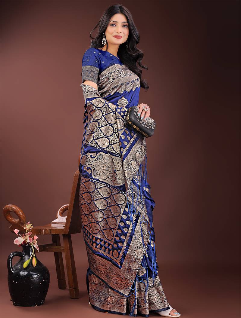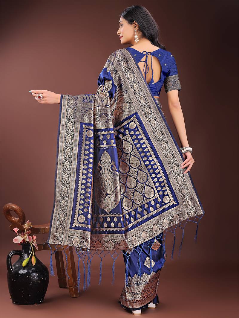 Navy blue color woven art silk saree with blouse