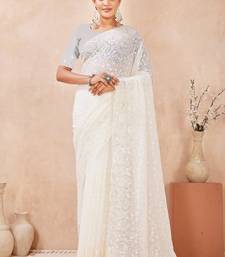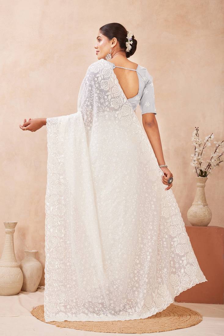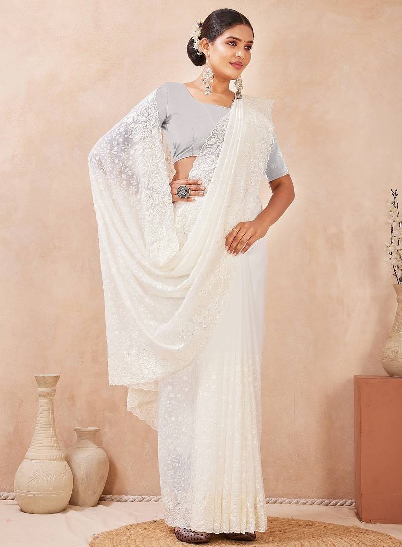 Off white color resham & sequins work georgette saree