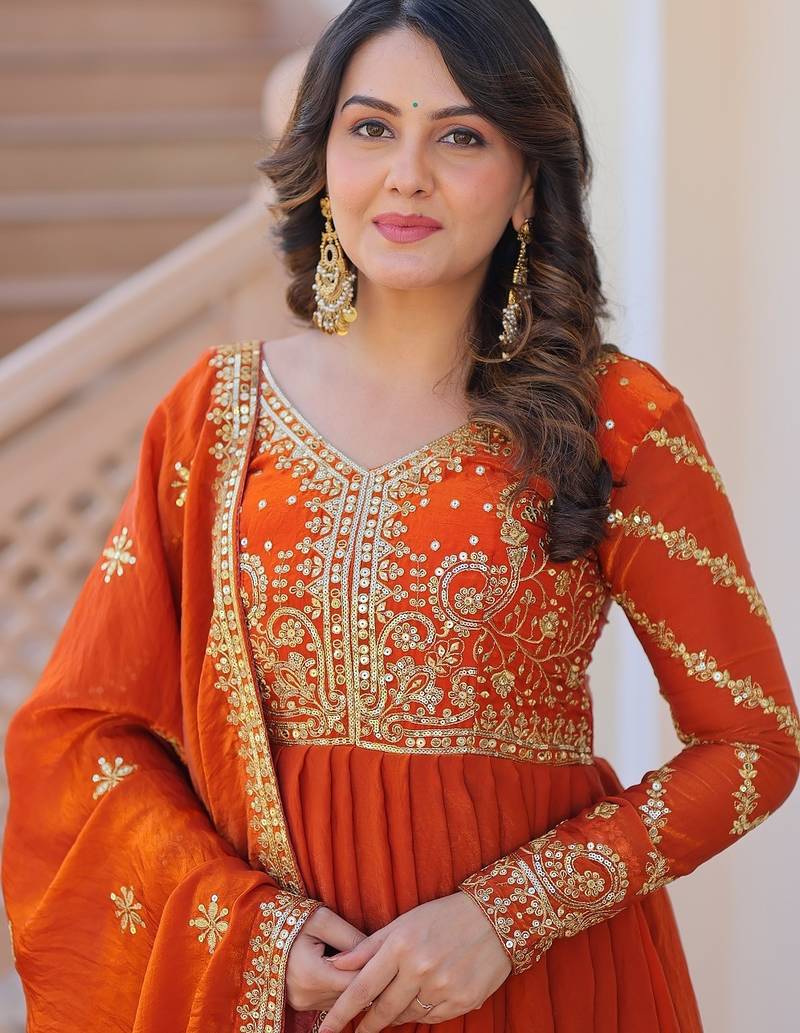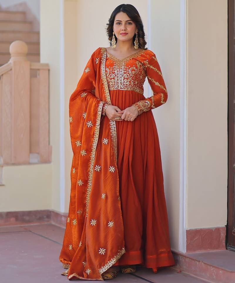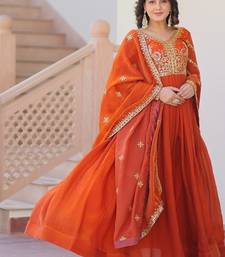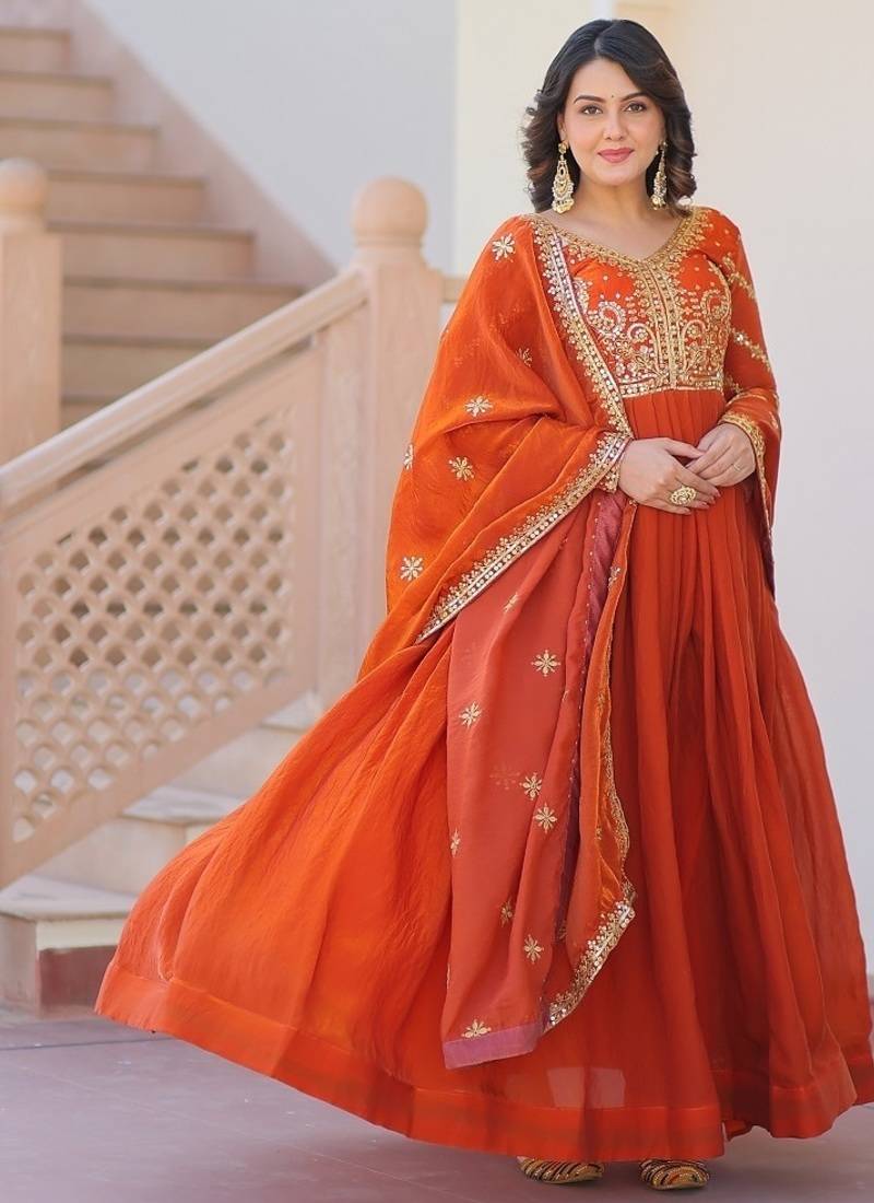 Orange color fendi silk zari sequins work gown dupatta stitched