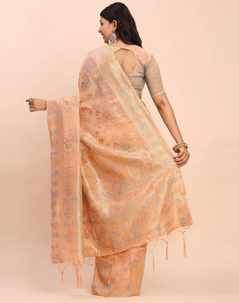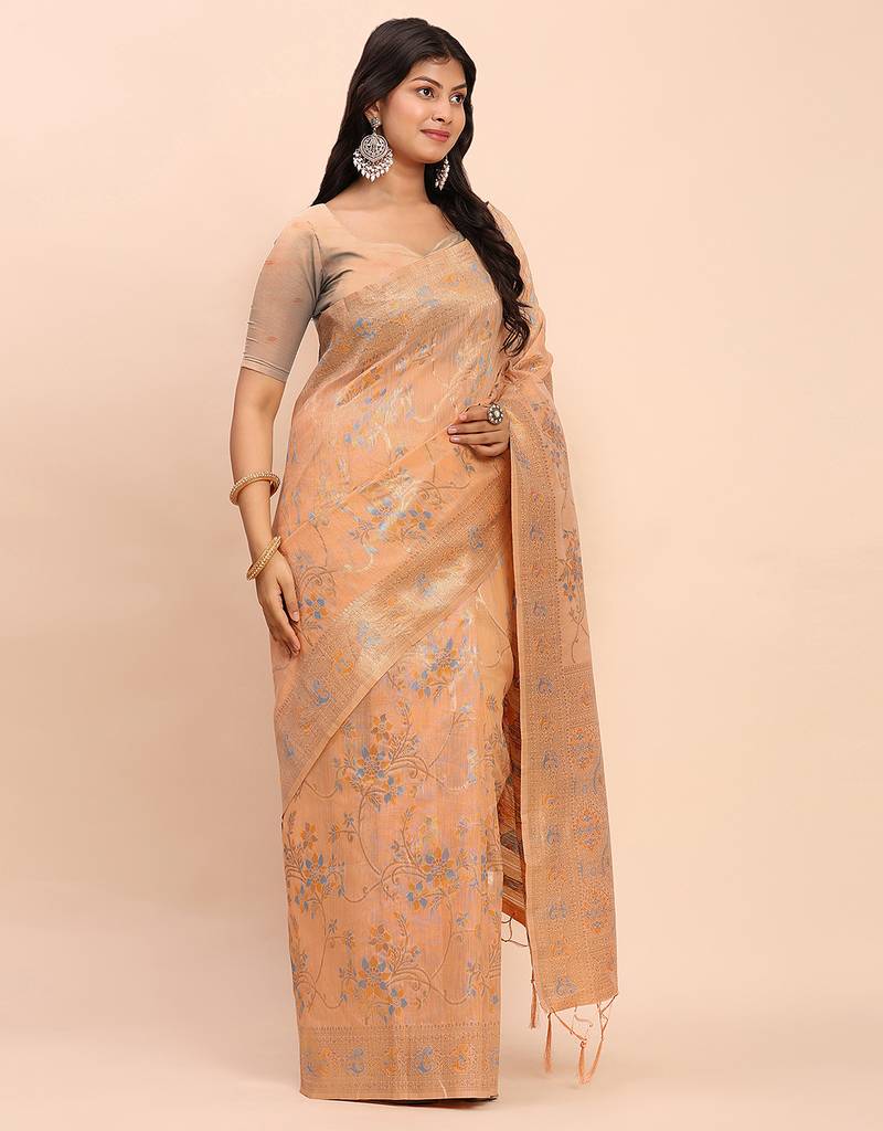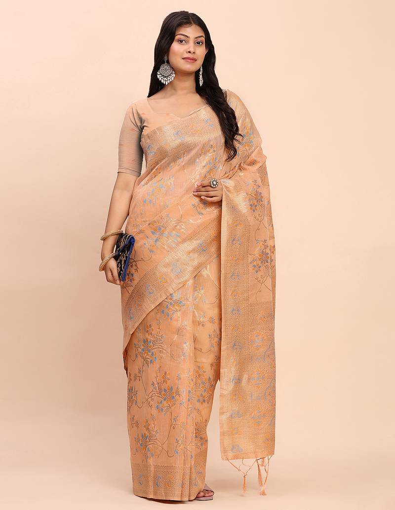 Orange color woven work linen cotton saree