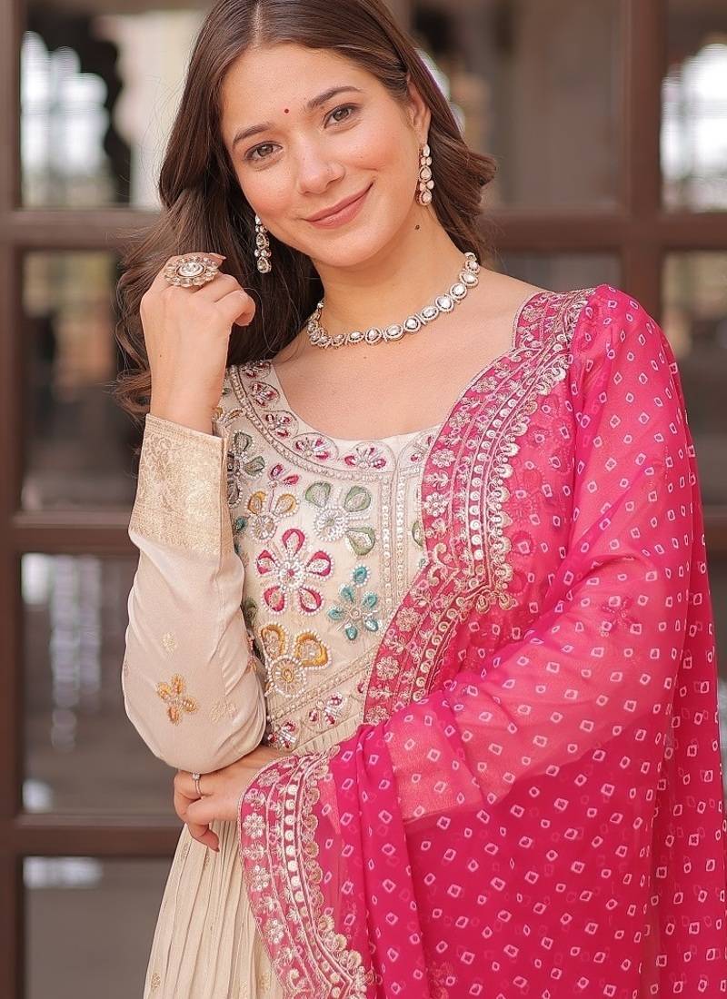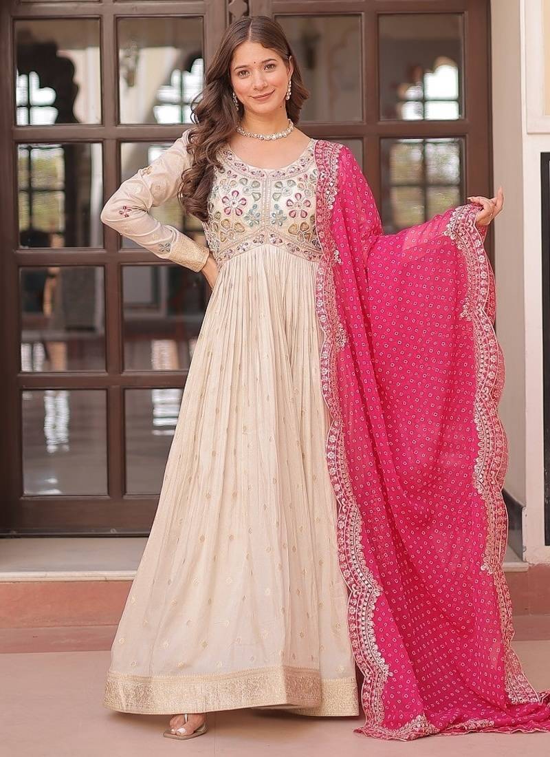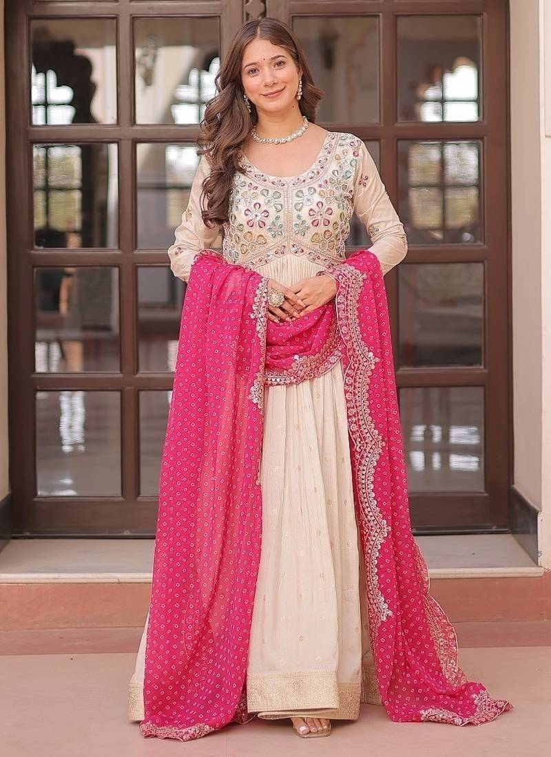 | Product Description | Experience The Allure Of Trending Cosmos Jequard Gown With Bandhani Printed Embroidered Cut Work Dupatta. Discover The Perfect Fusion Of Elegance And Grace. Shop Now For A Timeless Appearance.3 Mtr Flair Stitched With Canvas With Georgette With Bandhani Print With Embroidered Cut Work Dupatta. |