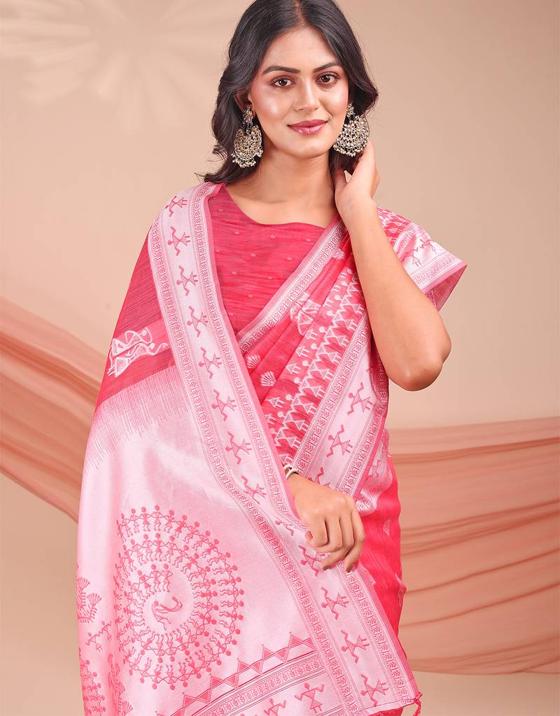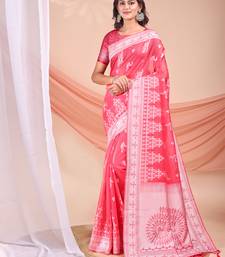 Pink color embroidered & woven linen cotton saree