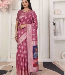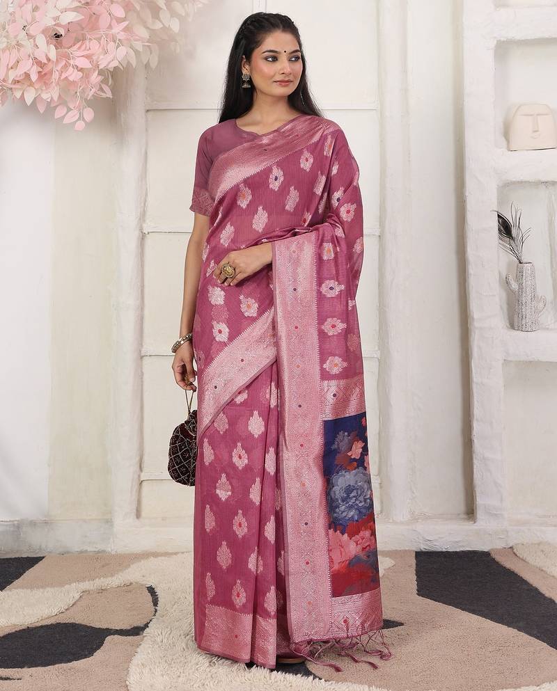 | Product Name | Pink Color Woven Linen Cotton Flower & Peacock Pallu Saree | |
