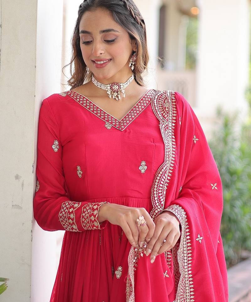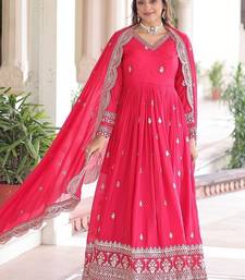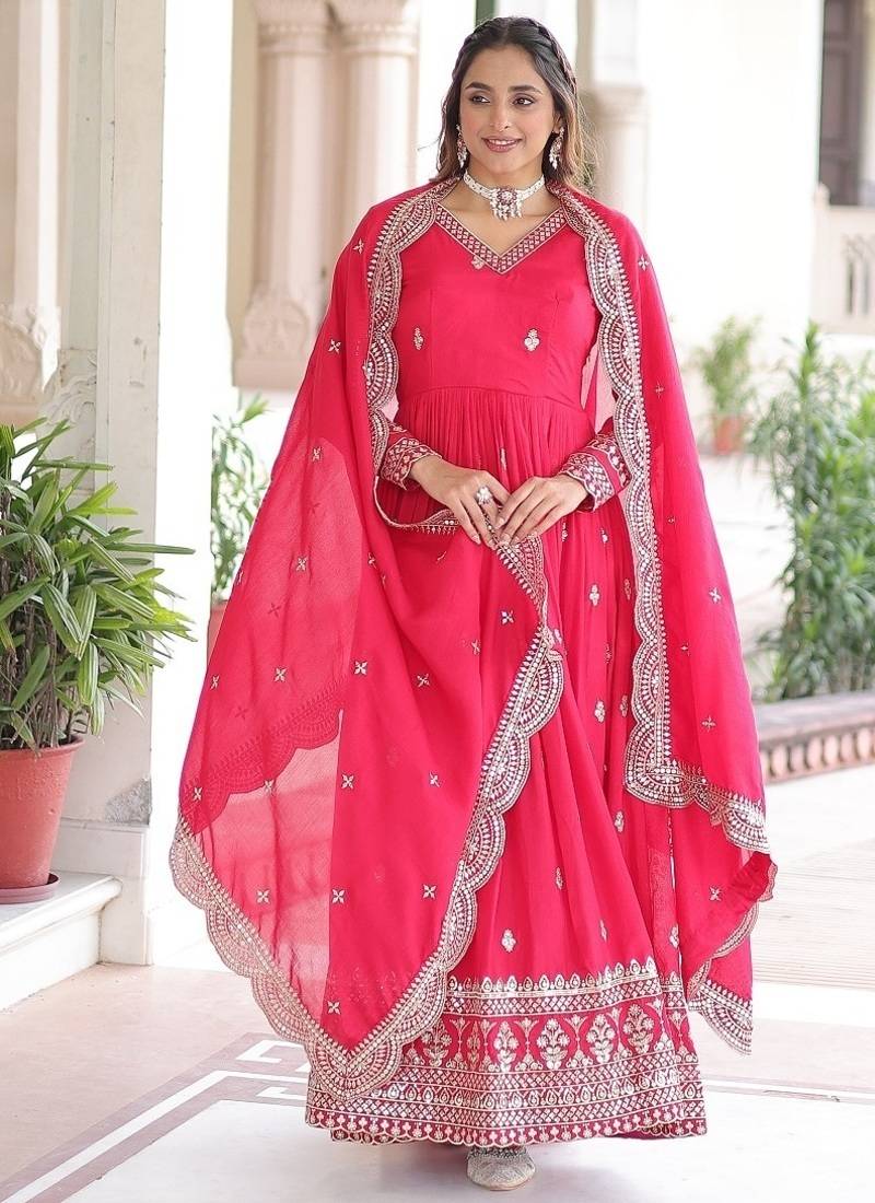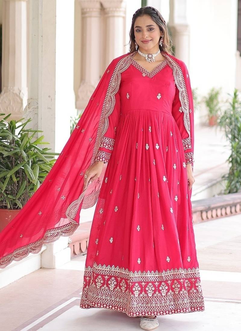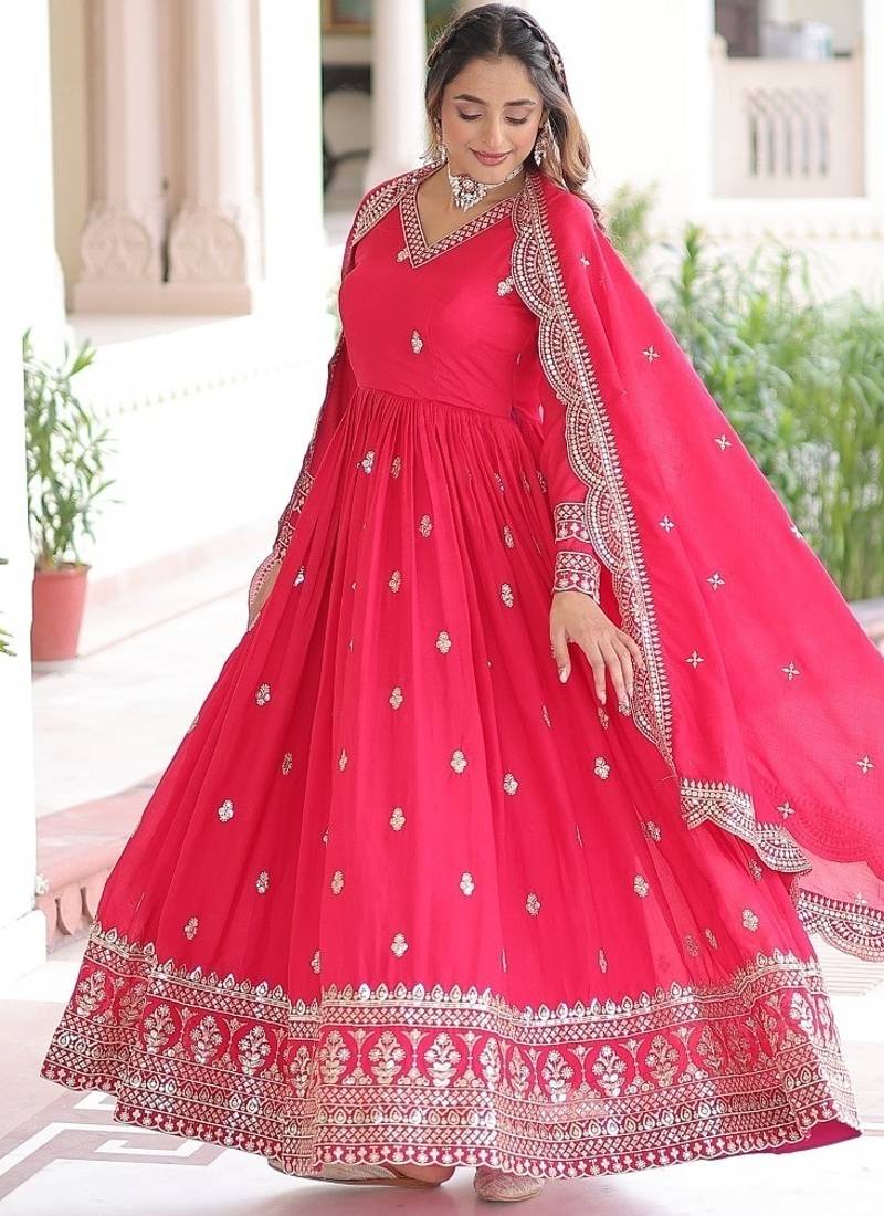 Pink color zari sequins embroidered work vichitra silk gown dupatta stitched
