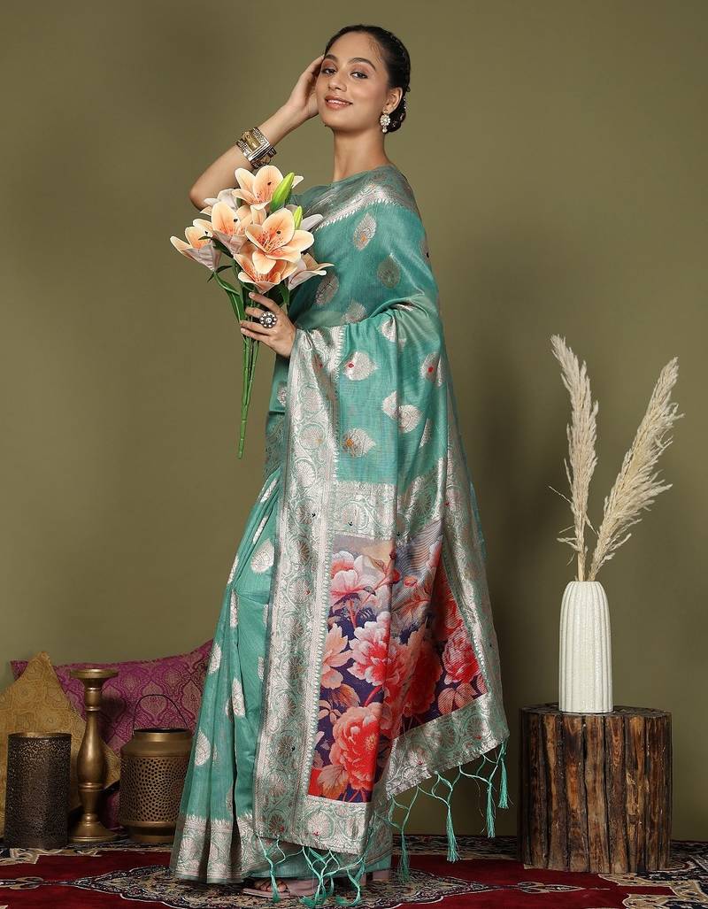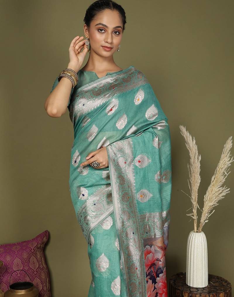 Rama green color linen cotton woven work flower pallu saree