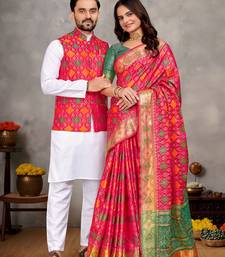 Rani color jacquard weaving silk couple combo men's kurta & pajama koti & women saree set