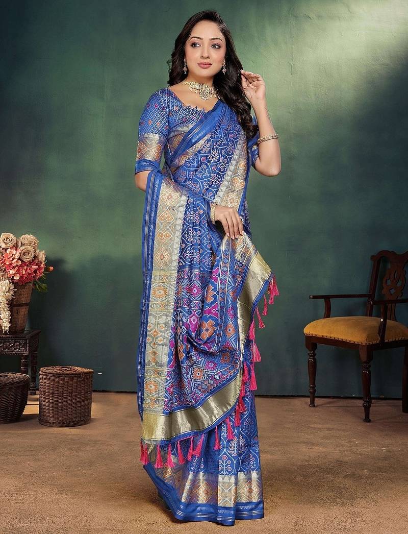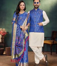 Royal blue color jacquard weaving silk couple combo men's kurta & pajama koti & women saree set