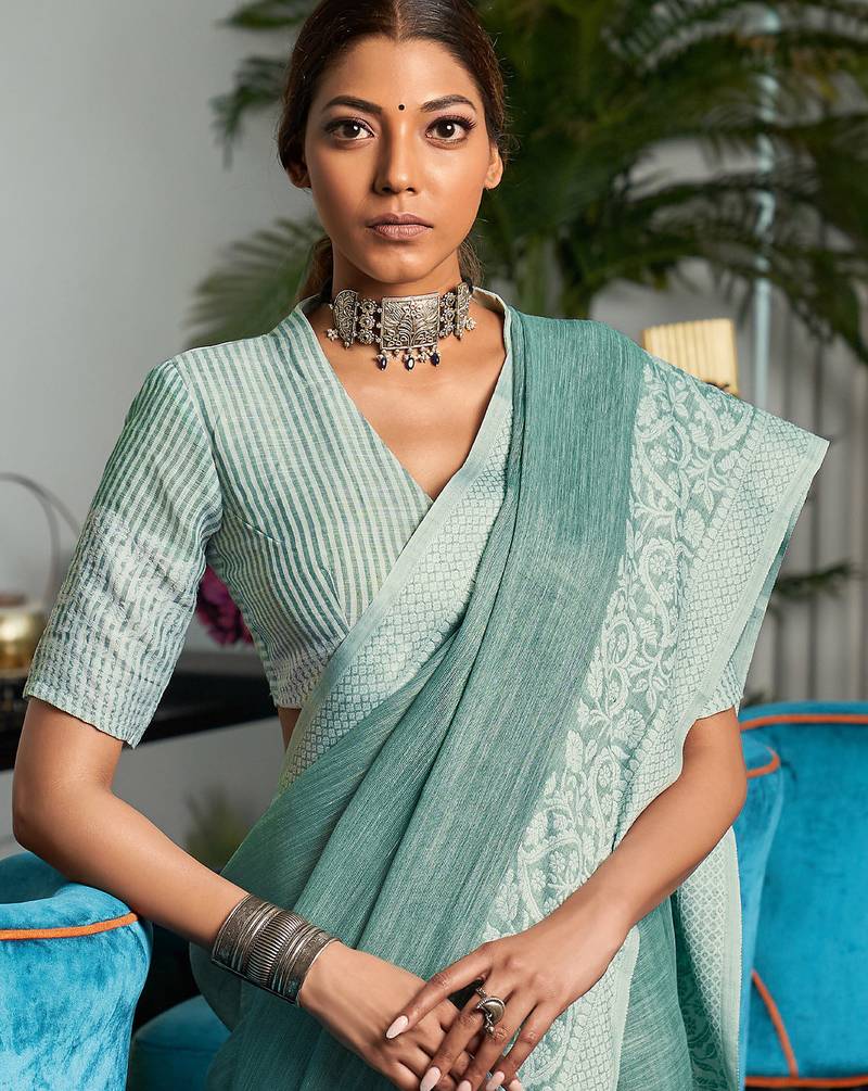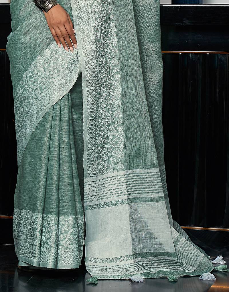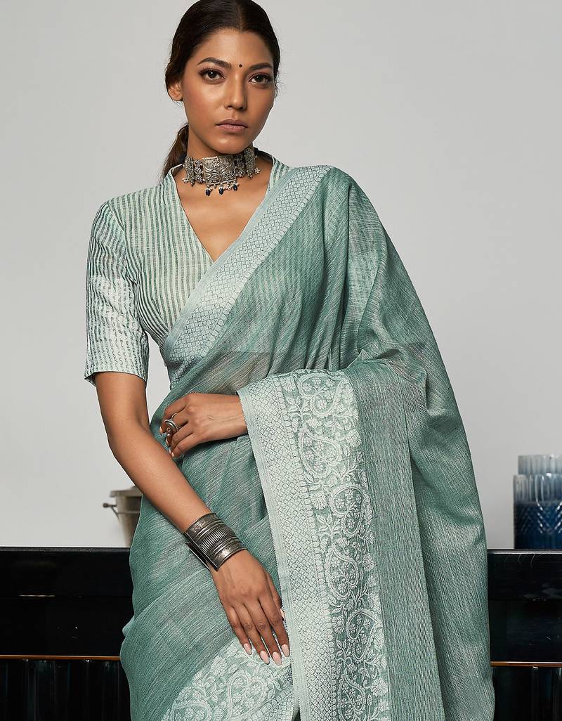 | Product Name | Sea Green Color Solid Zari Border Linen Cotton Saree | |