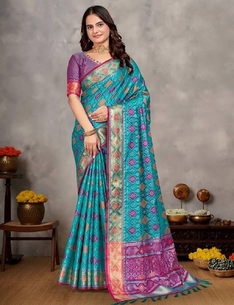Sky blue color jacquard weaving silk couple combo men's kurta & pajama koti & women saree set
